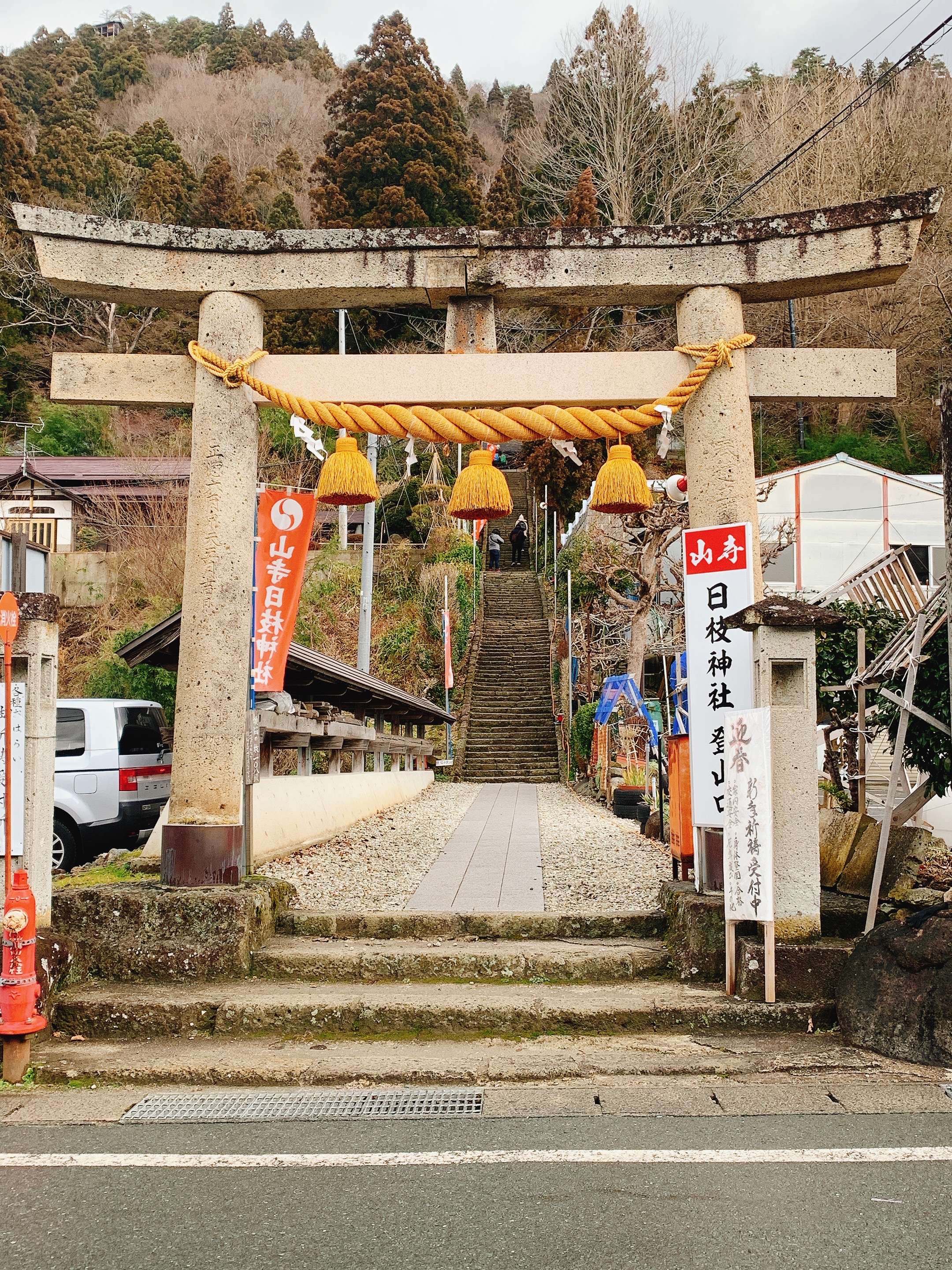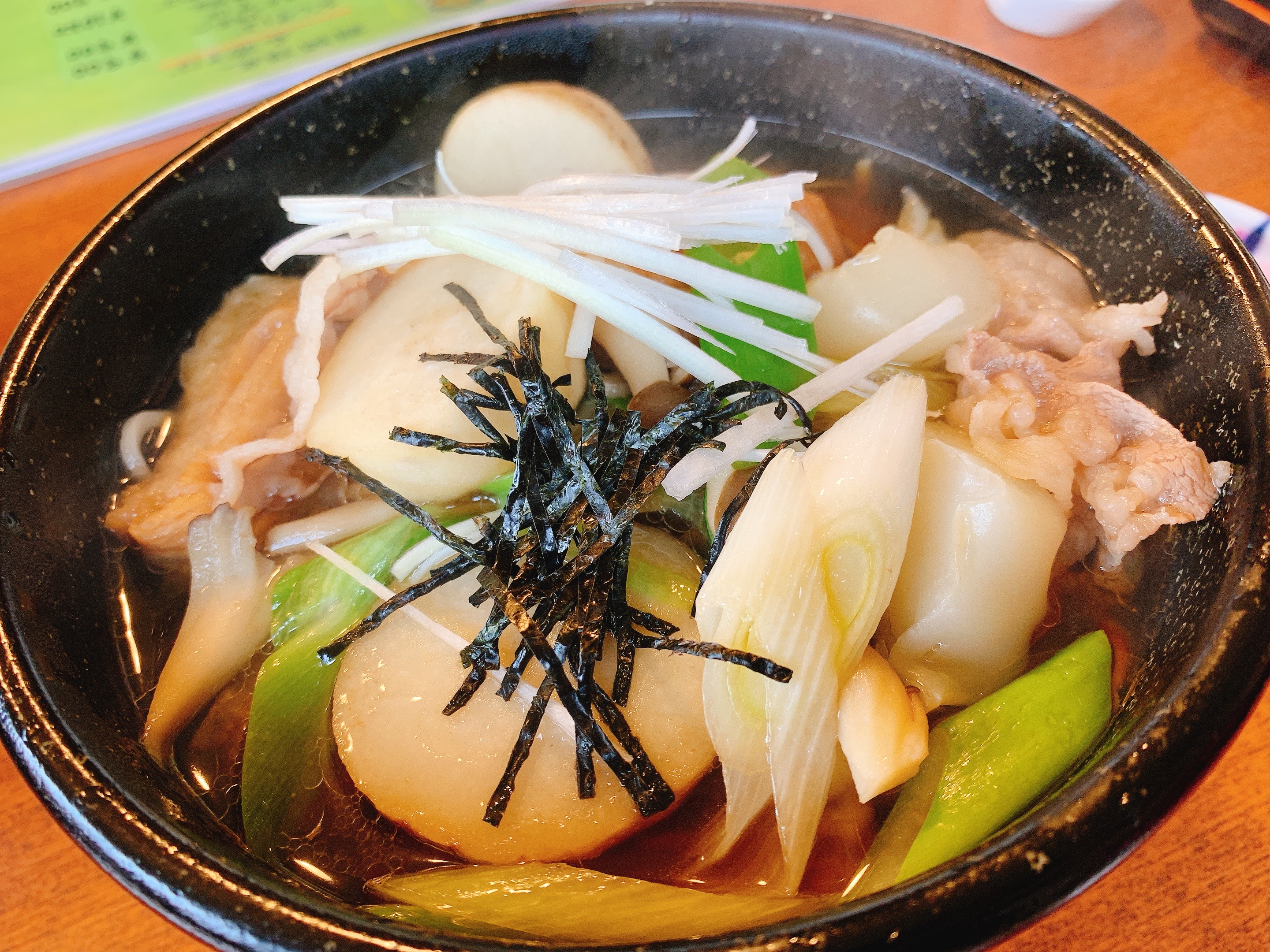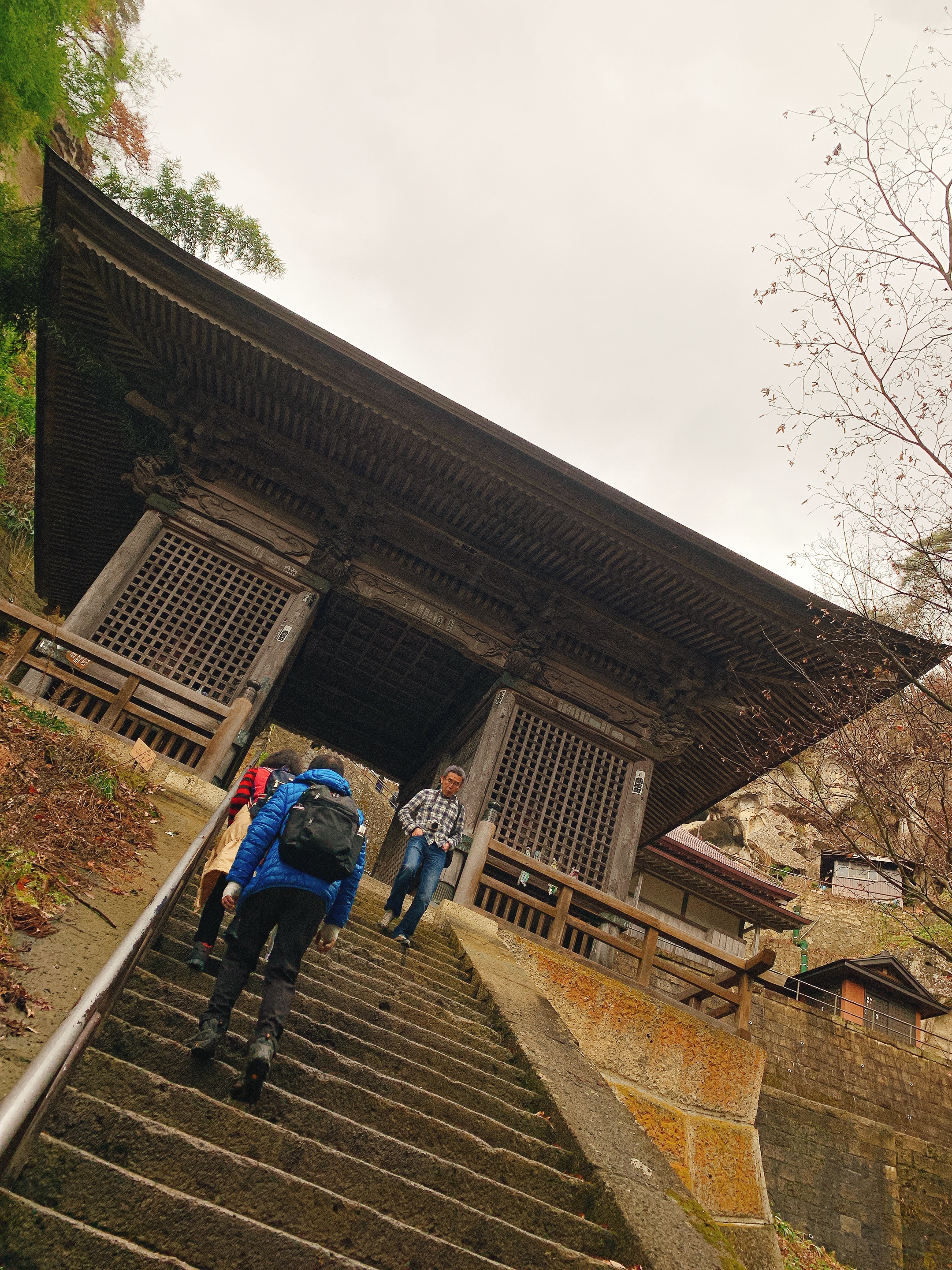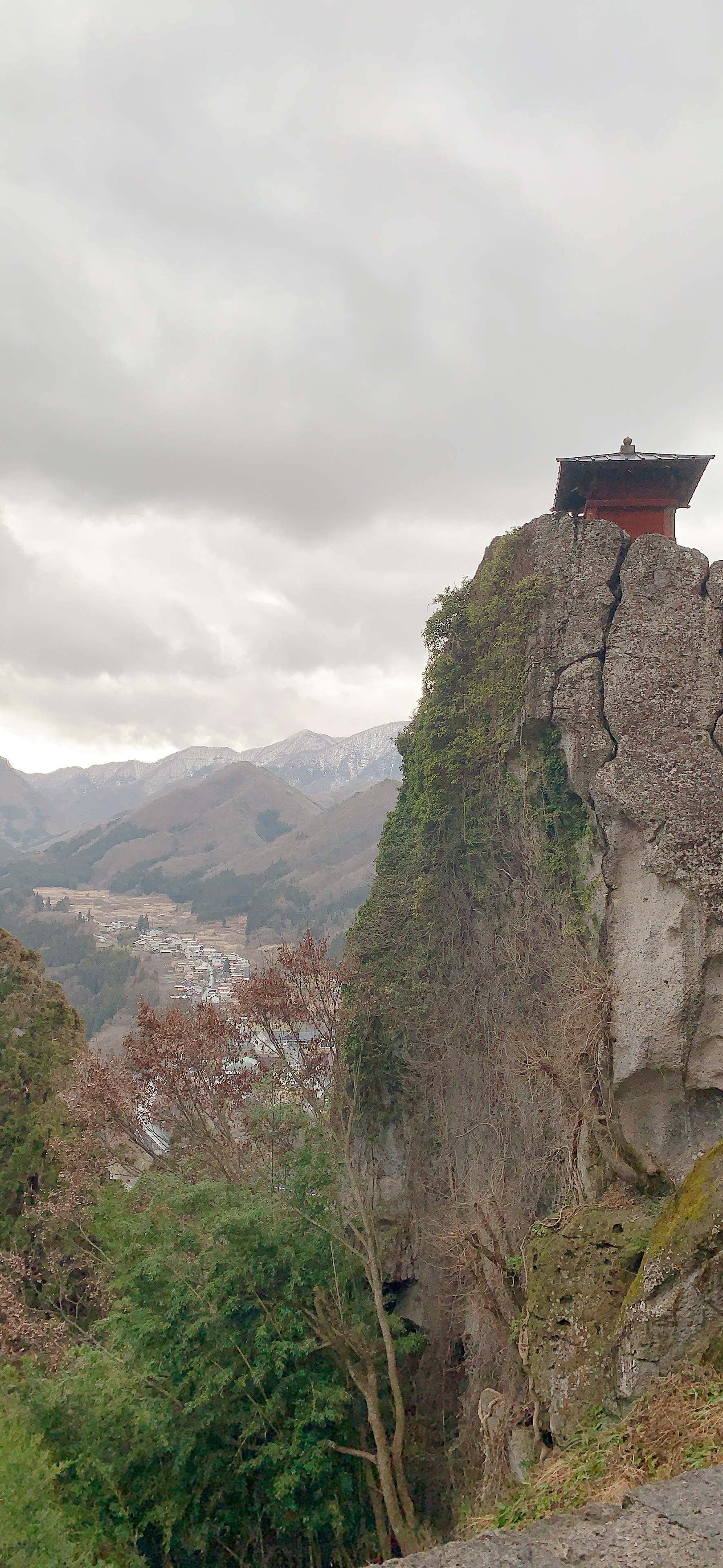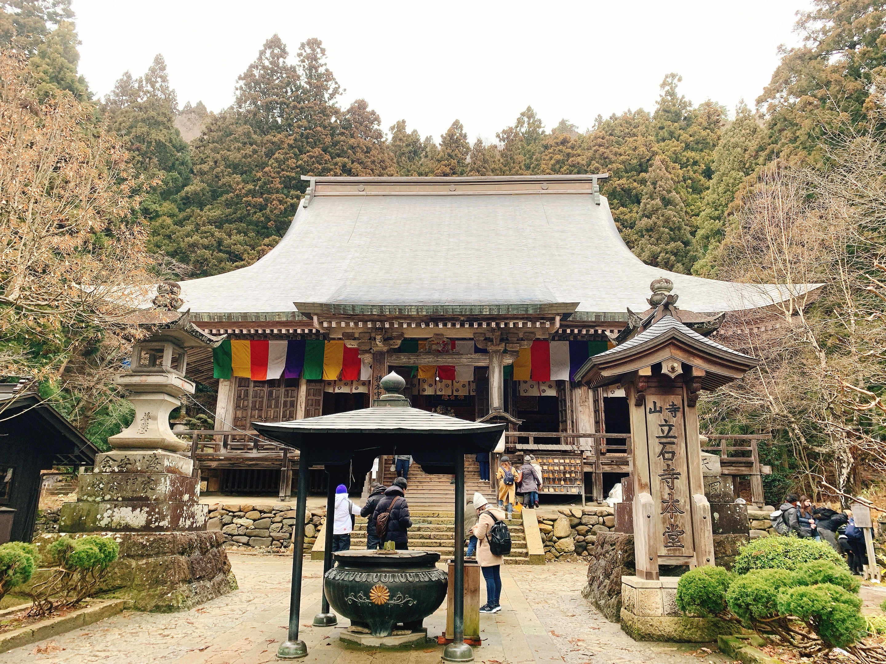 山寺也是來到山形大家不會錯過的地方,而我的印象中大家都是衝著很壯觀的冬季雪景來走一遭。但看到我的照片就曉得,我又帶賽羅,一點雪兒都沒有捏…..事後還被友人揶揄說:沒雪的山寺好醜。(洗勒靠……)不過都來了,我跟爹娘還是一步一步爬上去,還真的有夠陡峭,而且有多數踩點也不是很穩,完全可以想像有另外的友人是在積雪的狀態來此,然後是用爬的上下山,真的是有點危險性。好啦,說這麼多,爬到頂看到景致還是挺壯麗的啊,雖然沒有雪白的雪,而是偏枯黃的樹林與田地,也是有另外一種氛圍的,我是蠻喜愛的。下山後不意外地又是用餐時間,就稍稍微介紹一下山腳下的一間小店『お休処 対面石』,裡面可以吃到熱騰騰的湯麵跟在地的芋煮料理喔。