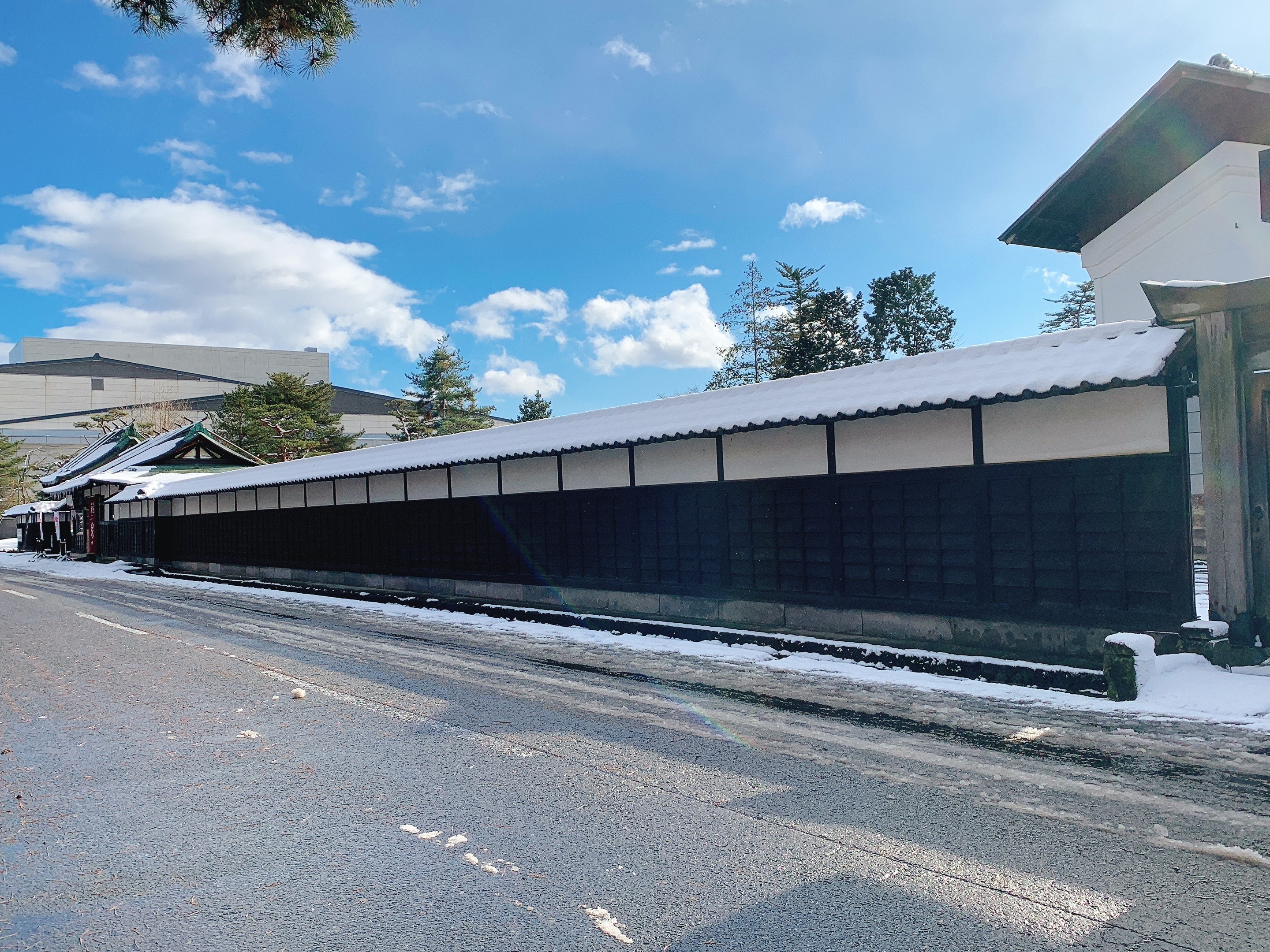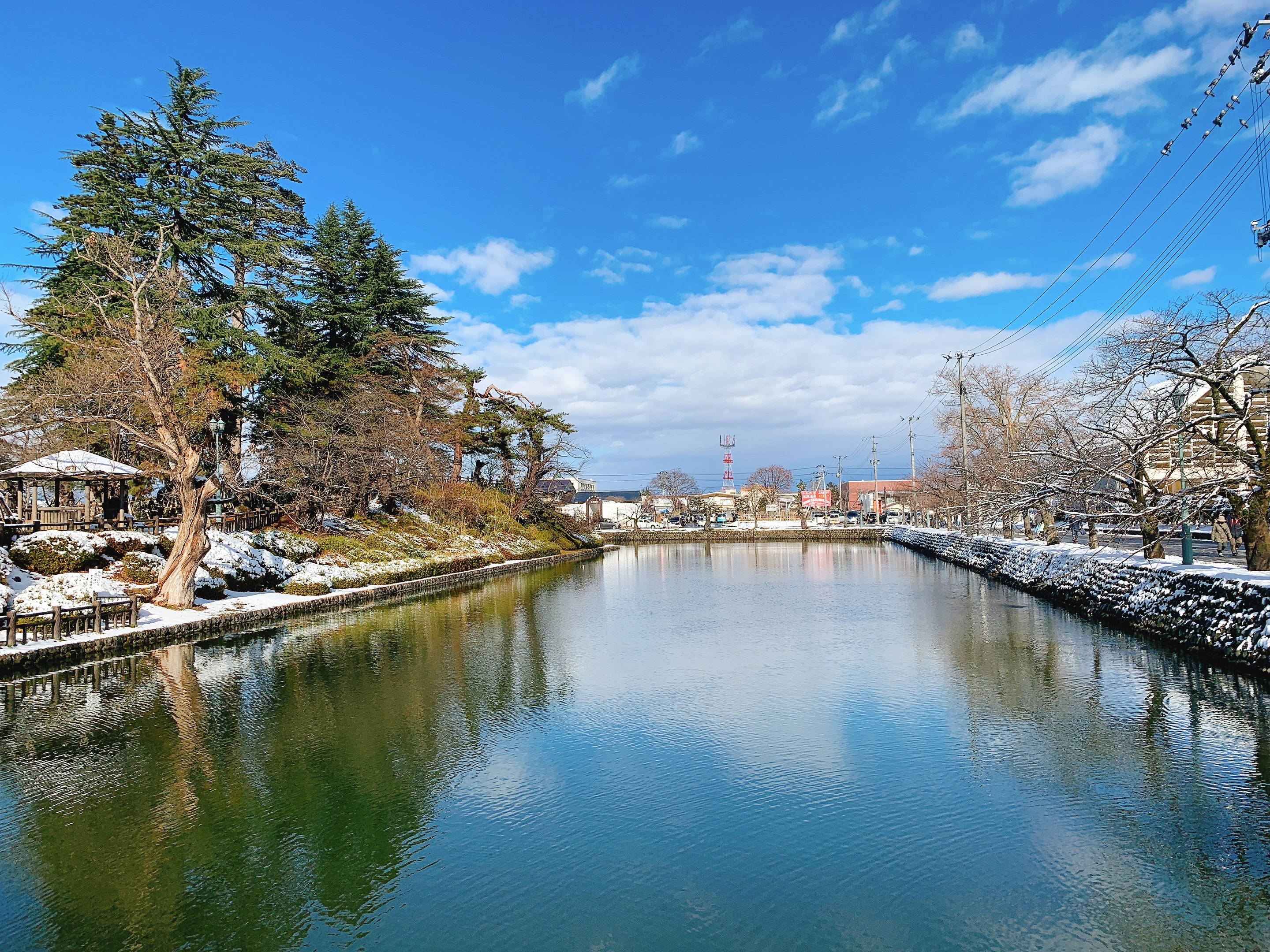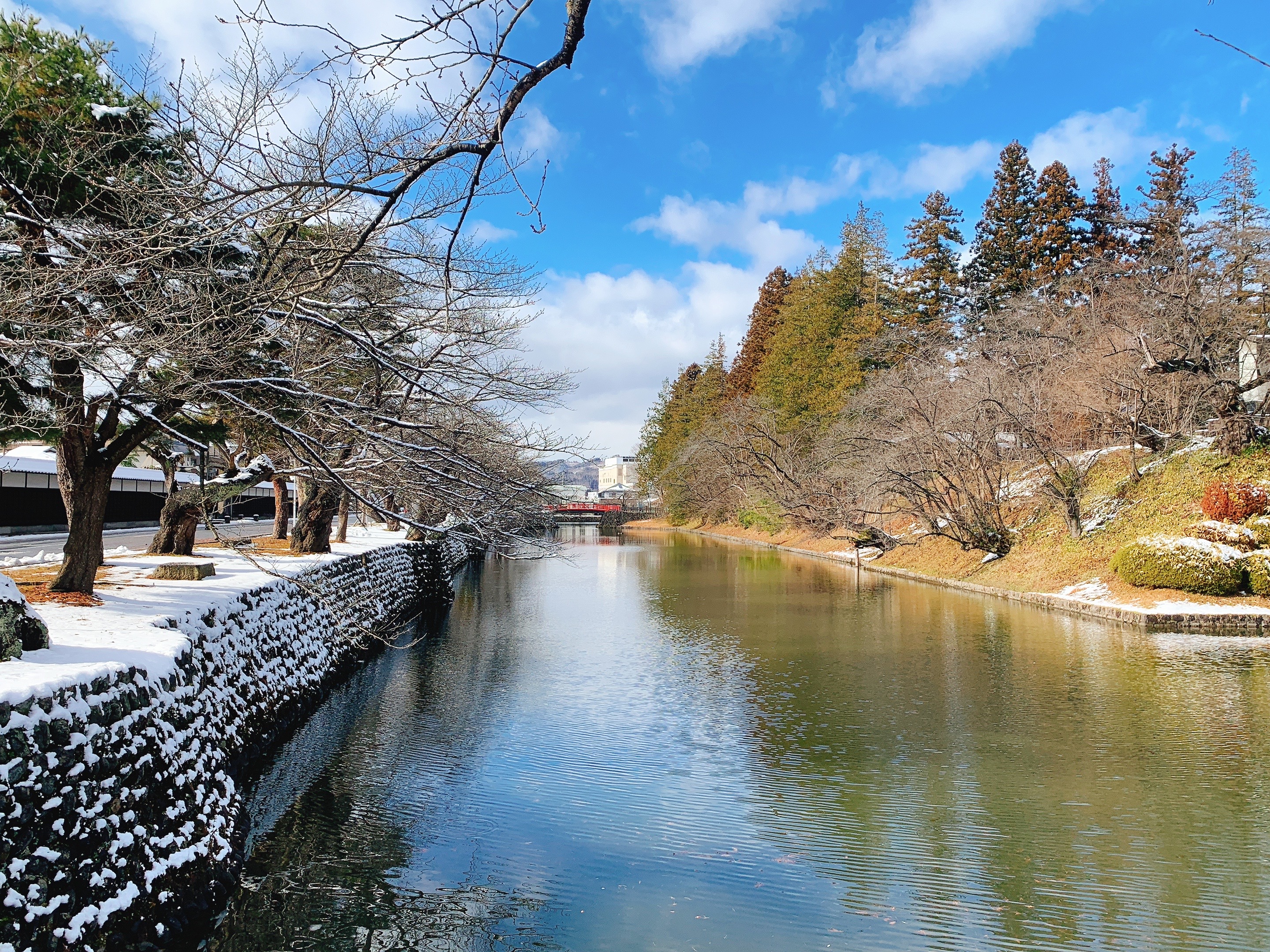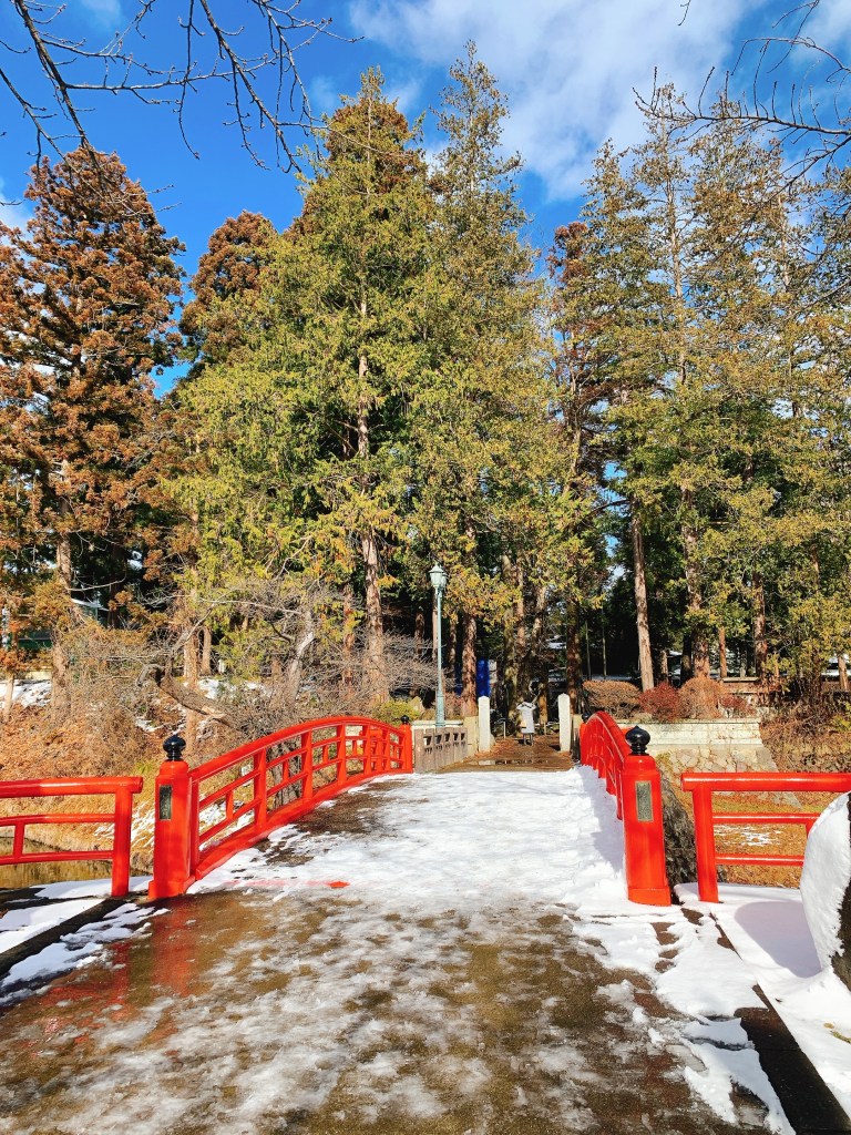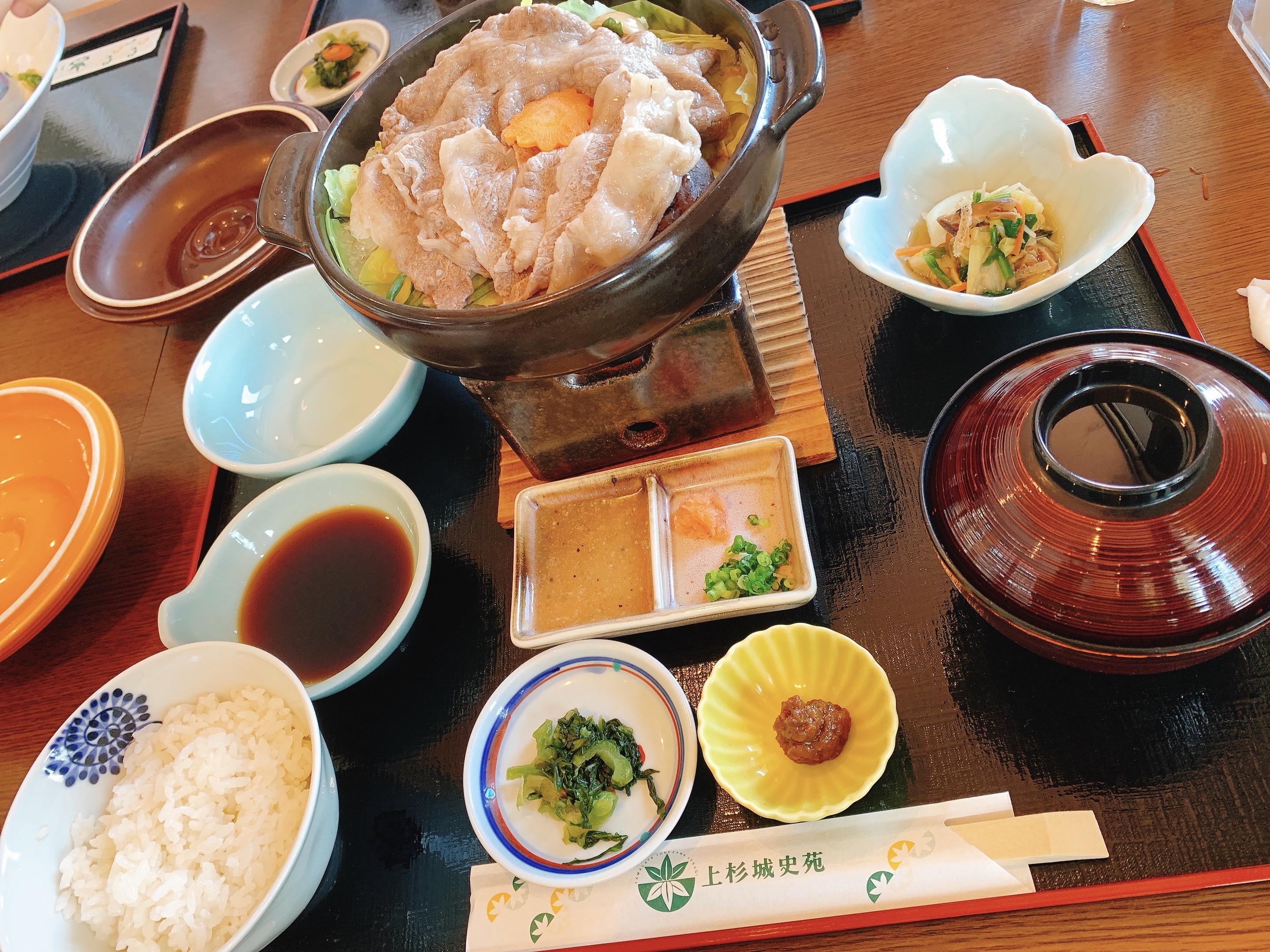 一路遇到缺雪的我們,來到了米澤市,在途中就開始見到遍地的積雪,抵達後也很夠意思了下了一場不小的雪,於是乎我們就得到了如此美麗的景象。我們來這的時候正好是元旦當天,所以遠遠就看到排了很長的人龍要進去神社,應該是日本過年晨鐘暮鼓祈福的儀式吧。我們還一度被人潮嚇到是不是要放棄,確定之後我們就繞了旁邊的道路在整個米澤城跡的周邊拍照看風景,然後再走進境內看看能接近到哪些建築。這邊的意外就是,原本設定好要在裡面用餐的餐廳果然因為元旦休業了,周邊也沒太多選擇,還好最後有在上杉城史苑裡面找到餐廳跟座位用餐,當下嘗試了山形牛,口感當然比不上和牛,但也是很滿足。