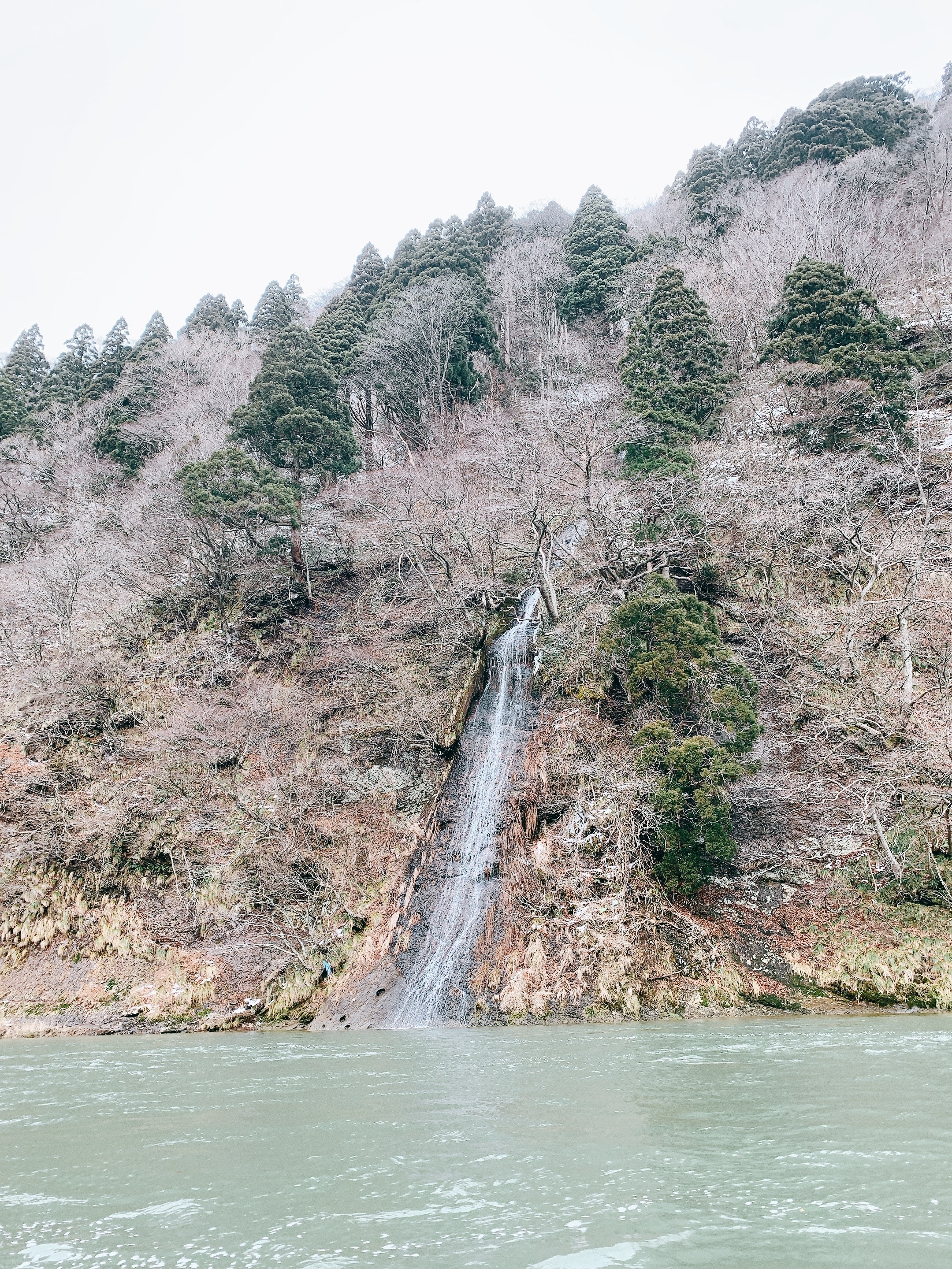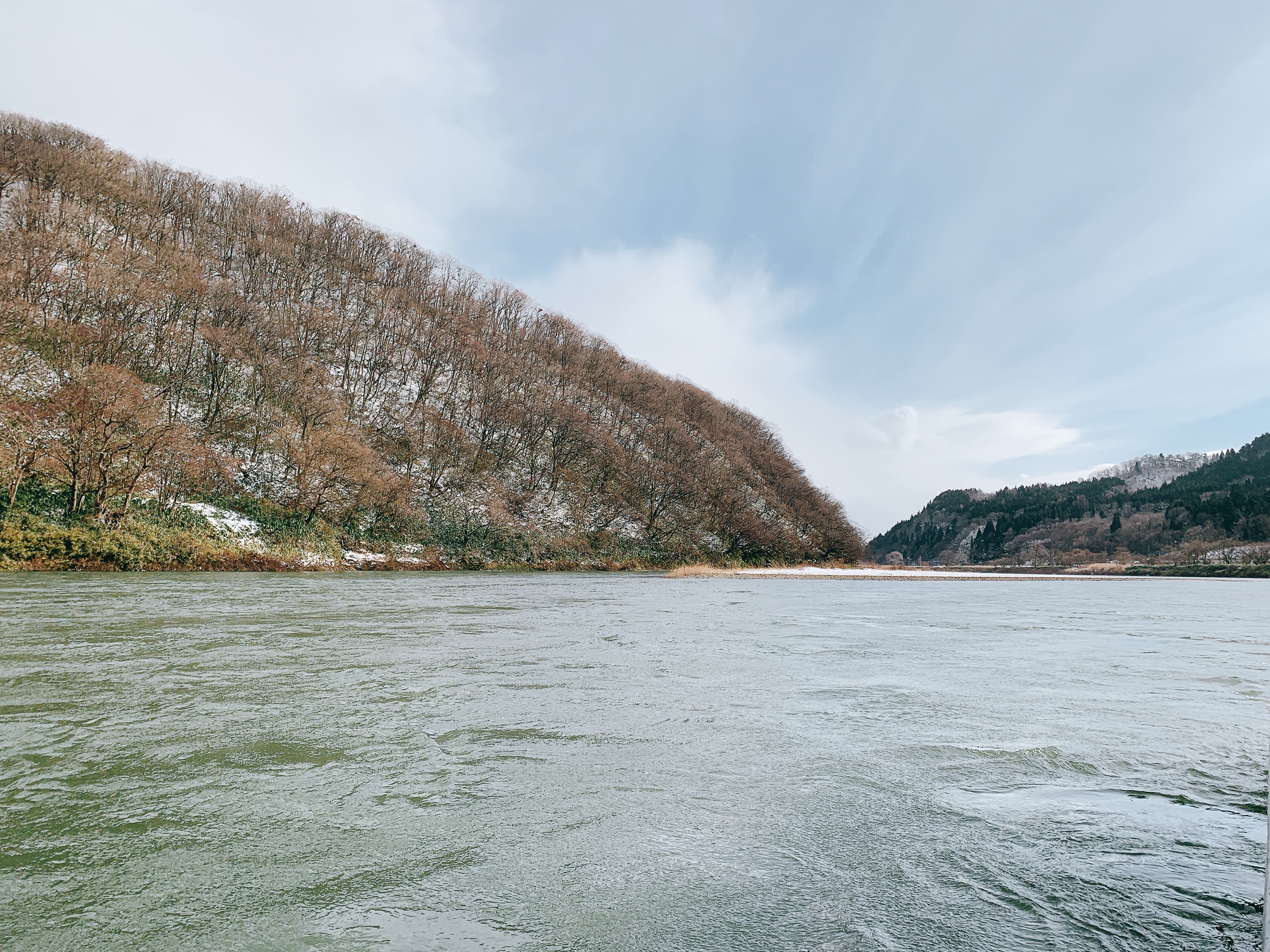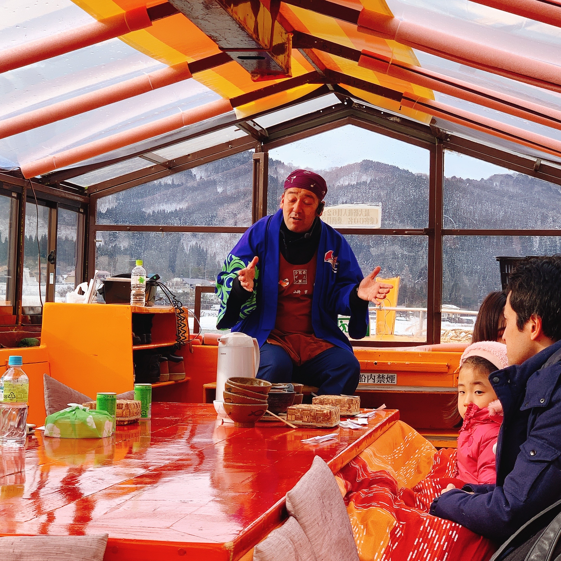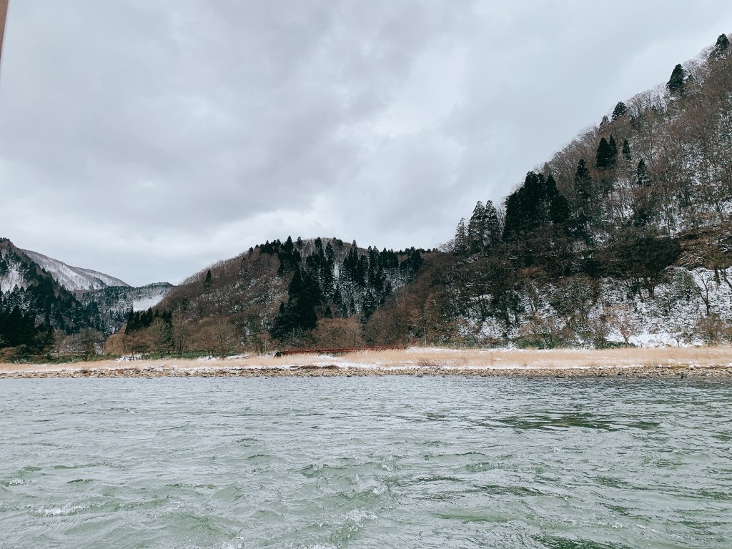 最上峽芭蕉ライン是一條遊河的專門航線,很推薦事前先上網預約搭船,順便也訂個船膳,編遊河邊聽船歌邊用午餐,能不愜意嗎?然後如果是冬季前往,很建議船上點個在地特色料理芋煮,冷冷的天在船上配上熱熱的湯,爽捏。雖然過程中聽不懂日文,但還是可以感受得出來船夫的歌聲很宏亮,下船時也很熱情,就不要吝嗇,找船夫大哥和個影吧,他很樂意的喔。