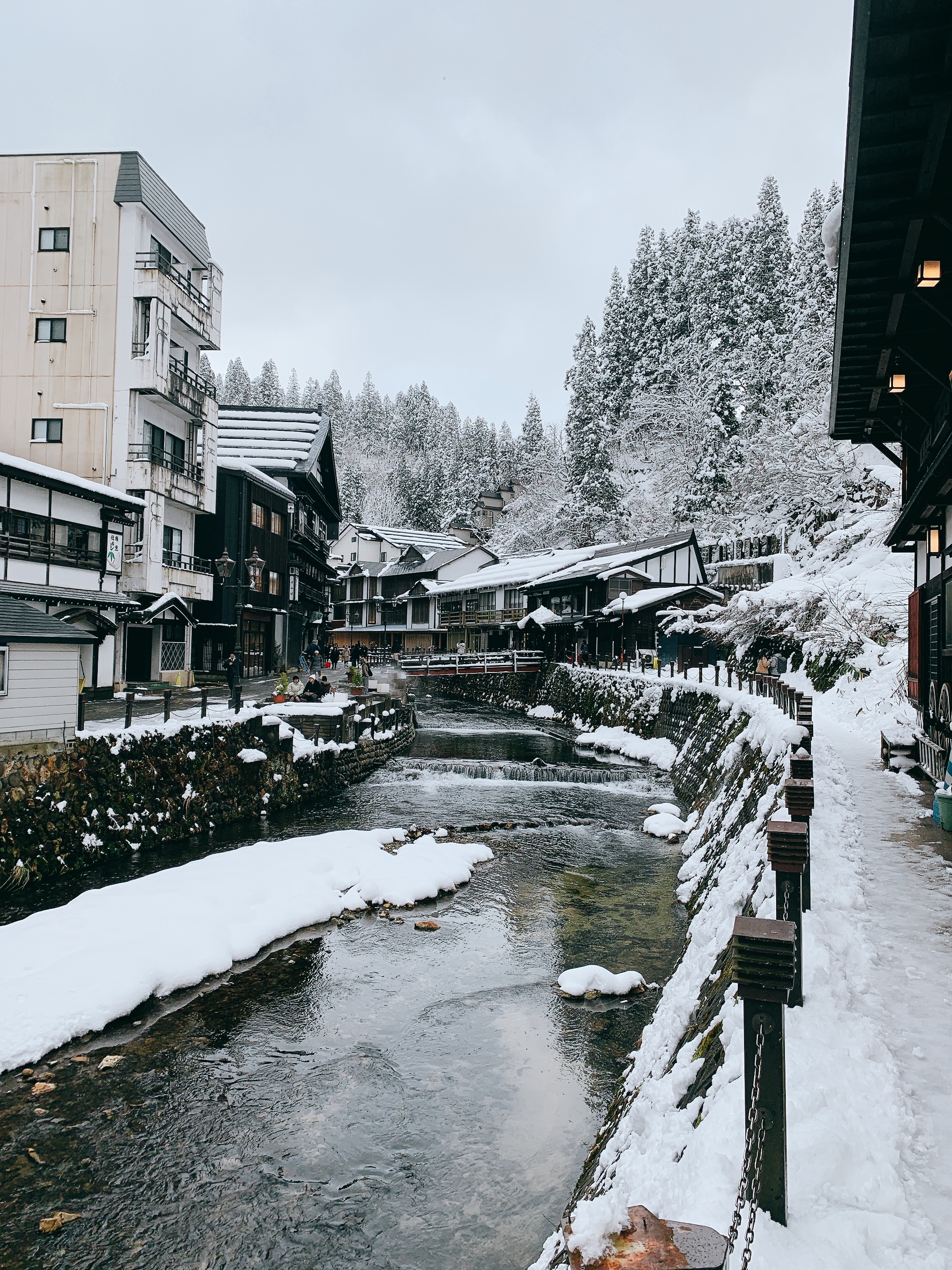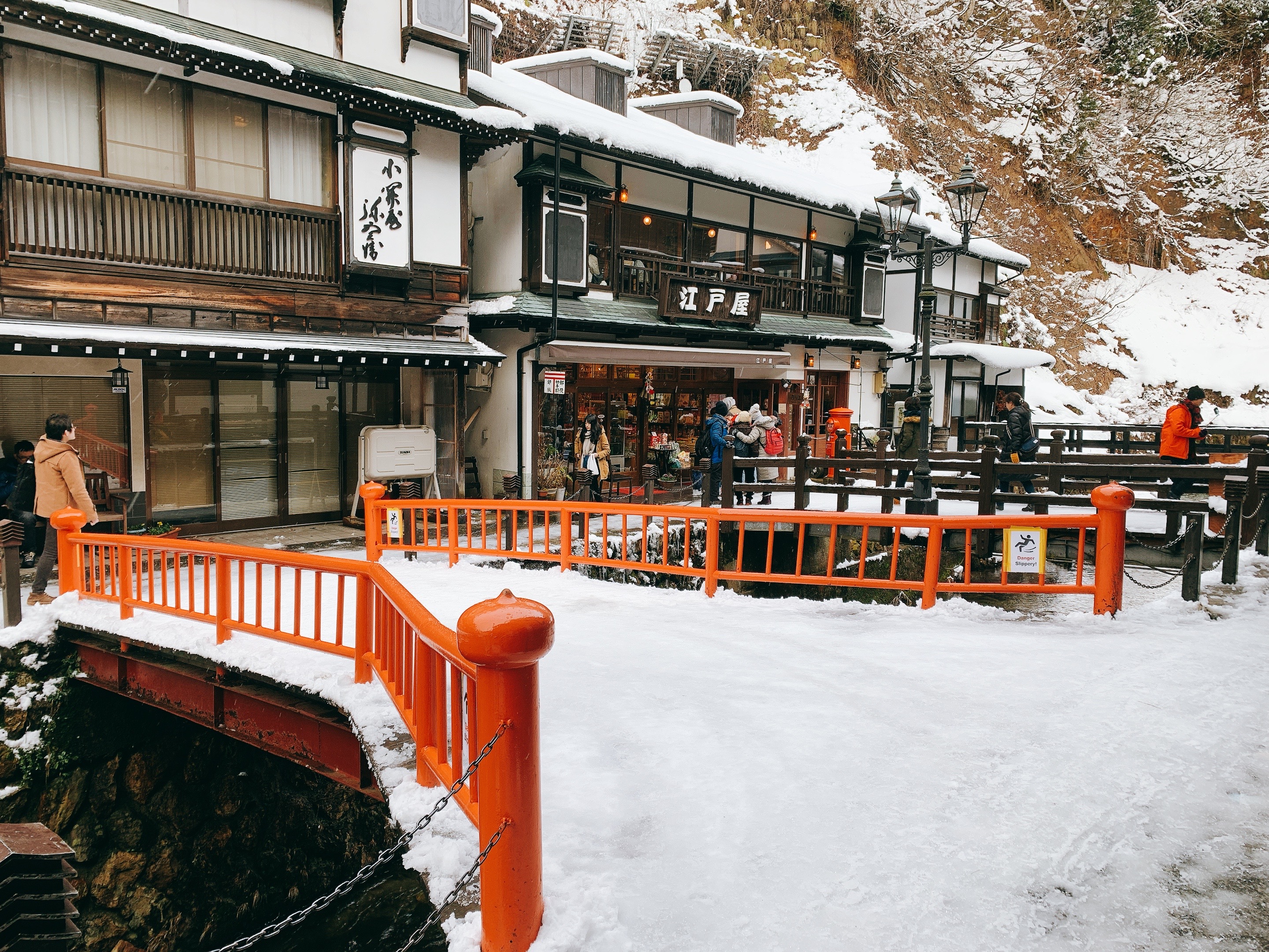 這個銀山溫泉大概是繼合掌村之後又再度打我自己臉的景點,網路上瘋傳的美照已經讓這邊成為熱鬧到不行的一個觀光地了,然後住宿真的爆難訂。(對,我就是訂不到!)雖然訂不到住宿,但來這邊走走拍照總可以吧。剛下車其實沒啥感覺,想說很普通啊,然後走了一段,傳說中的溫泉街才真正映入眼簾,真的是要說哎呦威呀,怎麼這麼夢幻…..不過要溫馨提醒的是,這邊因為來來去去的人潮實在太多了,地上的雪都被踩踏而且結成冰了,走路真的要很小心啊,各位。溫泉街走到底還有個白銀公園,不過因為冬季積雪太深了,有安全疑慮,所以更深入的路就封閉了,安全還是第一呀。接著要說注意事項了,雖然大石田車站有專車按表載客到銀山溫泉,但是搭車的人真的很多,可以提早開始排隊就提早去排隊;離開的時候也真的提早一點開始排隊,然後因為路線不同,要注意不要排錯羅。