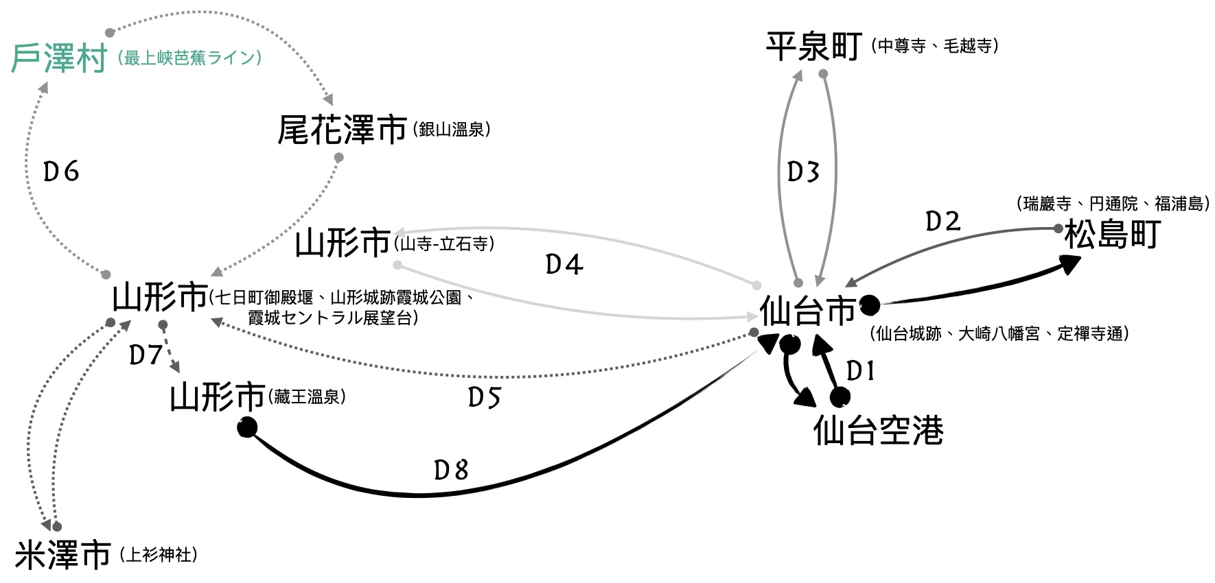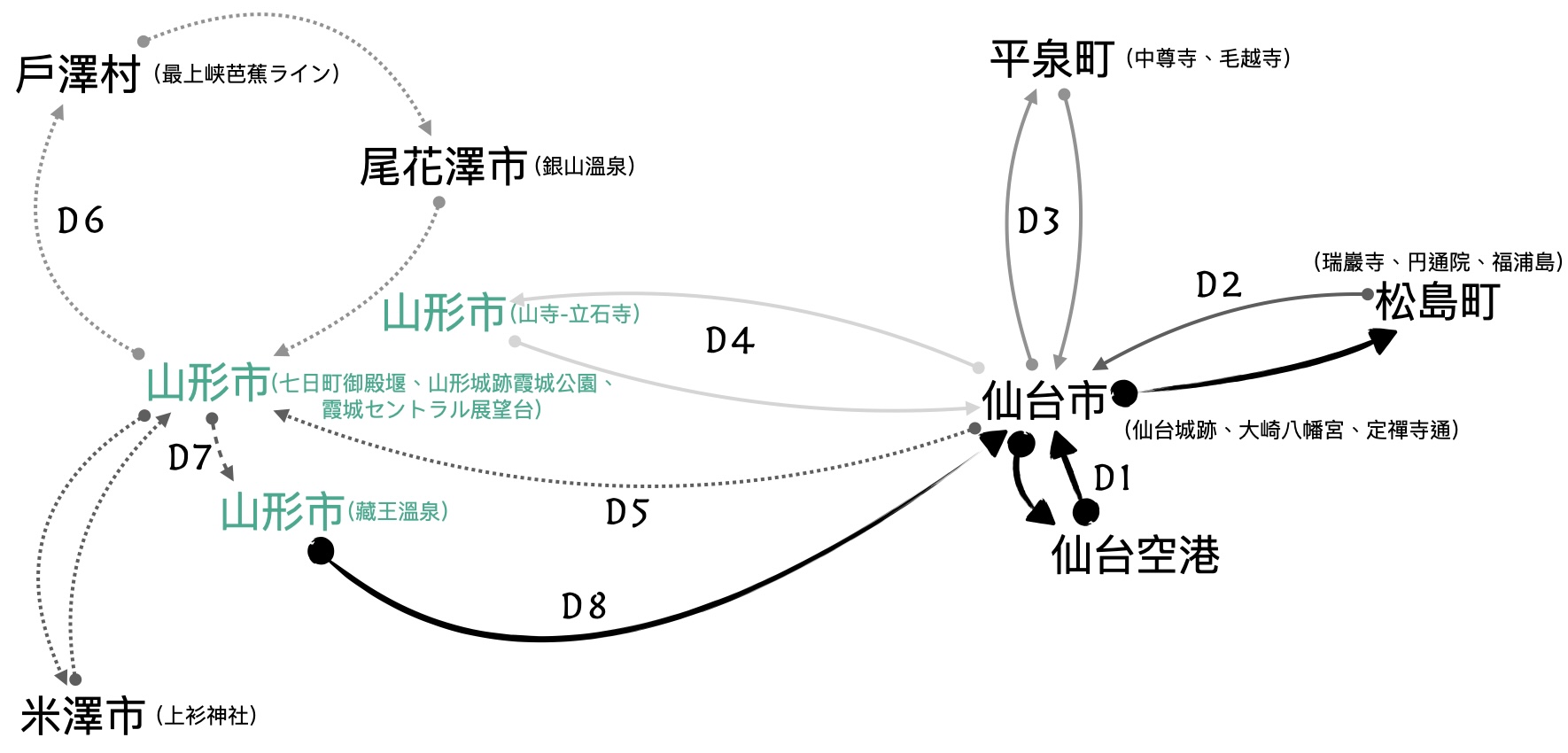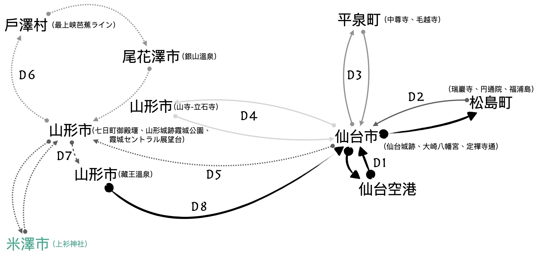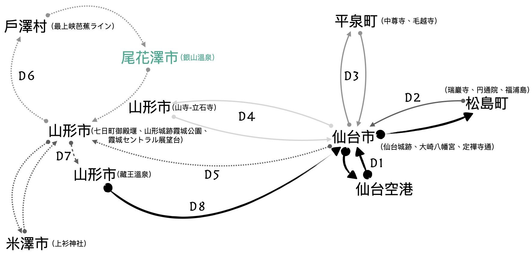 山形縣廳所在,最上氏修築山形城後發展;有日本最古老的現存櫸木建築;除了歷史文化,也是溫泉與滑雪勝地。