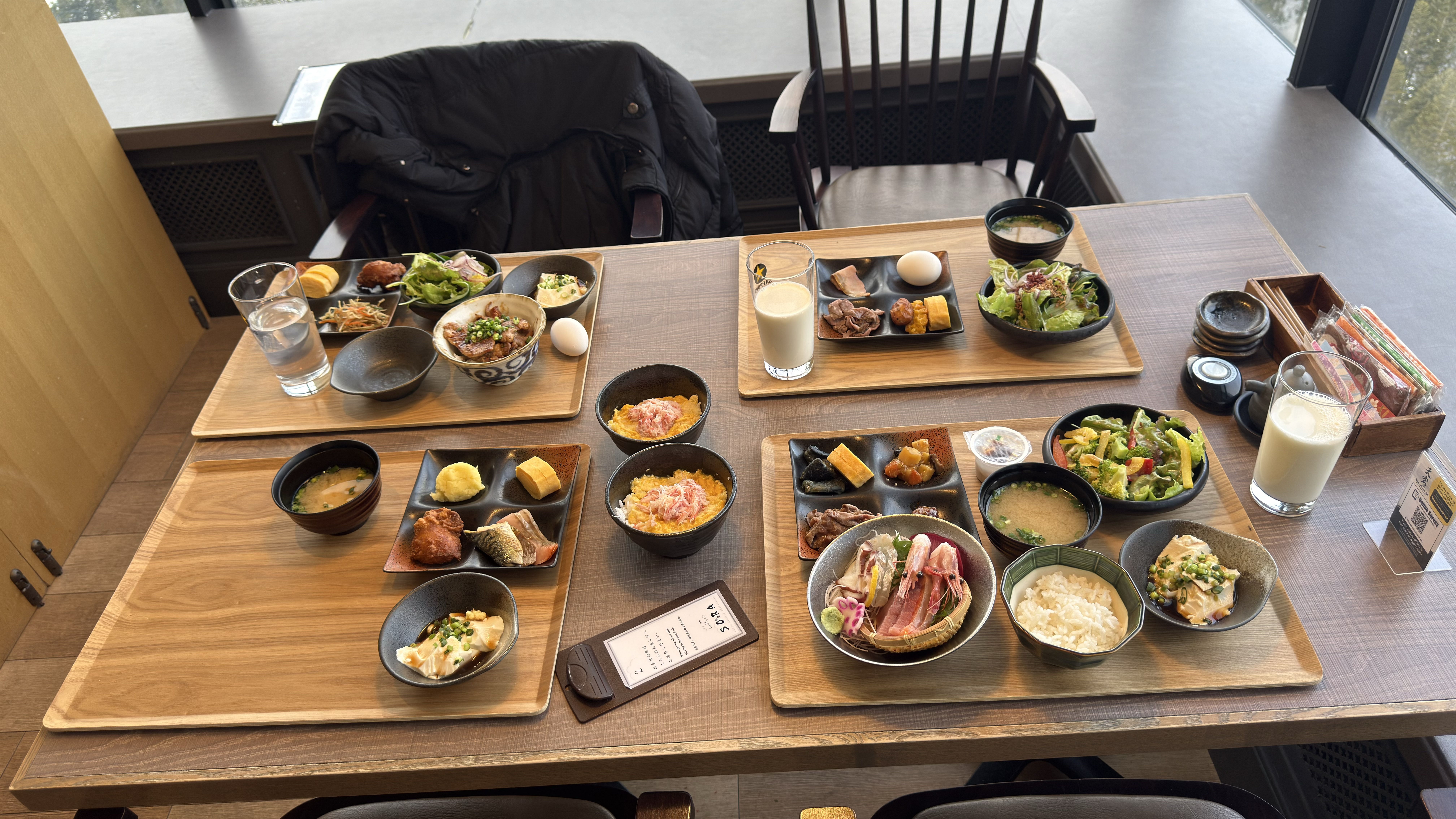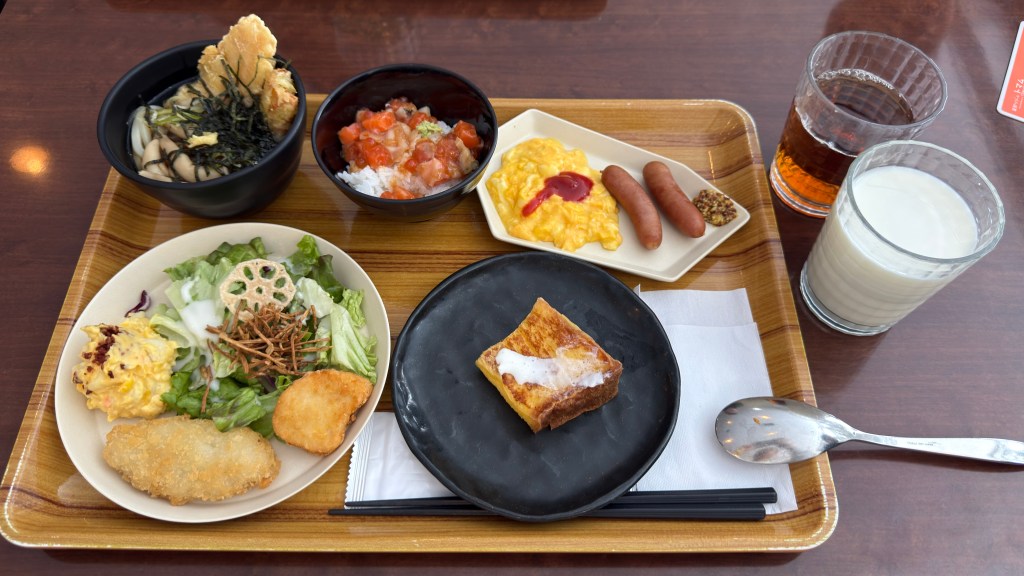 由於我們總共住四天三夜,所以討論之後決定每天早餐都試試不同餐廳,因此老早就去請櫃檯人員幫忙預訂席位。天空-SORA就是其中的一間。這邊有提供早餐與晚餐,晚餐是涮涮鍋,讓人有點難以想像早餐時段會推出什麼樣的內容。最後只能說,難以想像的話也真的不用想像,因為整個早餐吃下來的心得只有沒有心得,因為口味跟餐點內容真的毫無記憶點。雖然提供了四種主餐豚丼、蟹肉丼、海鮮丼跟生魚片可以做選擇,我們同行四人也點中了其中的三樣,結果沒有一個人的評價是正片的,更不用說其他自助式的餐點,真的沒什麼好提起的耶!好令人失望的一餐啊。好啦!真要說就是可以看看高樓的景色。(啊然後勒?)