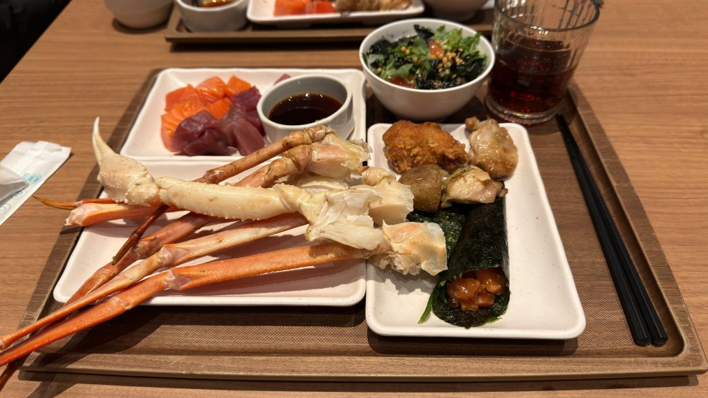 Buffet Dining Hal也算是蠻知名的一間自助餐,裡面主打蟹類跟鮭魚吃到飽,而且得提前非常多時間在網站上就預訂才吃得到。這邊晚上記得是分兩個時段,我們是第二個時段進去的,一進到餐廳就可以看到人潮會直接往螃蟹區集中,當然我們也就跟著一起排了。後來其中一個同行的友人才說,何必一開始去排,反正大家一定是拿完第一輪之後就不太會再去拿了,而且螃蟹也沒有限量啊!一段話把我們另外三個去排隊的講得像笨蛋一樣XD。不過齁,講完這螃蟹,還真的就不知道要講什麼了耶!除了松葉蟹吃起來真的蠻爽的以外,其他料底的口味真的又讓人記不住了。唯一值得拿來說嘴的只有其中一道茶泡飯,我跟其中一個同行友人都大推。至於另一個主打的鮭魚,也真的是很普,就是個沒有油脂香的魚塊堆,害我失手拿了太多,吃到一個厭世。怎麼會又是個令人有點失望的餐廳呢⋯⋯。