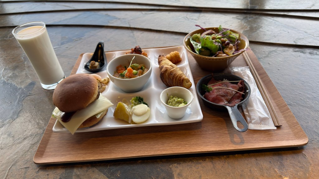 Grilled AGI同樣是在Risonare內的一間餐廳,也一樣有提供早餐跟晚餐,於是我們也是提早順利的約到了其中一天的早餐時段。一樣帶著慢滿的興致前往,結果又是一個只剩下風景的餐廳。整個早餐的內容大概就是自製小和牛漢堡跟烤牛肉是跟這間餐廳主題有相關的。那漢堡裡的和牛真的很普通,沒有什麼香氣,而那盤烤牛肉也是吃不出個所以然。總之,我們再度踩雷啦!