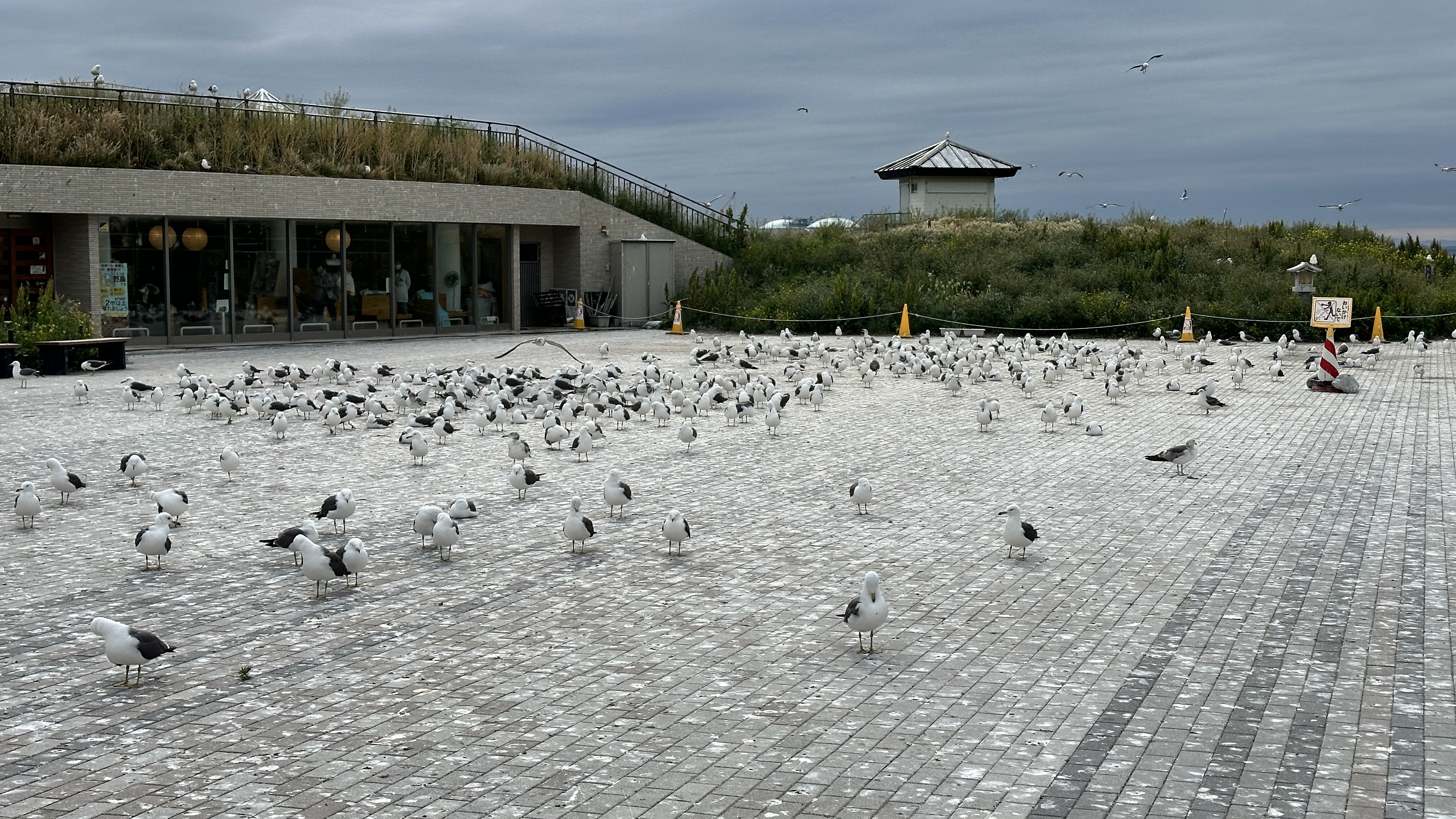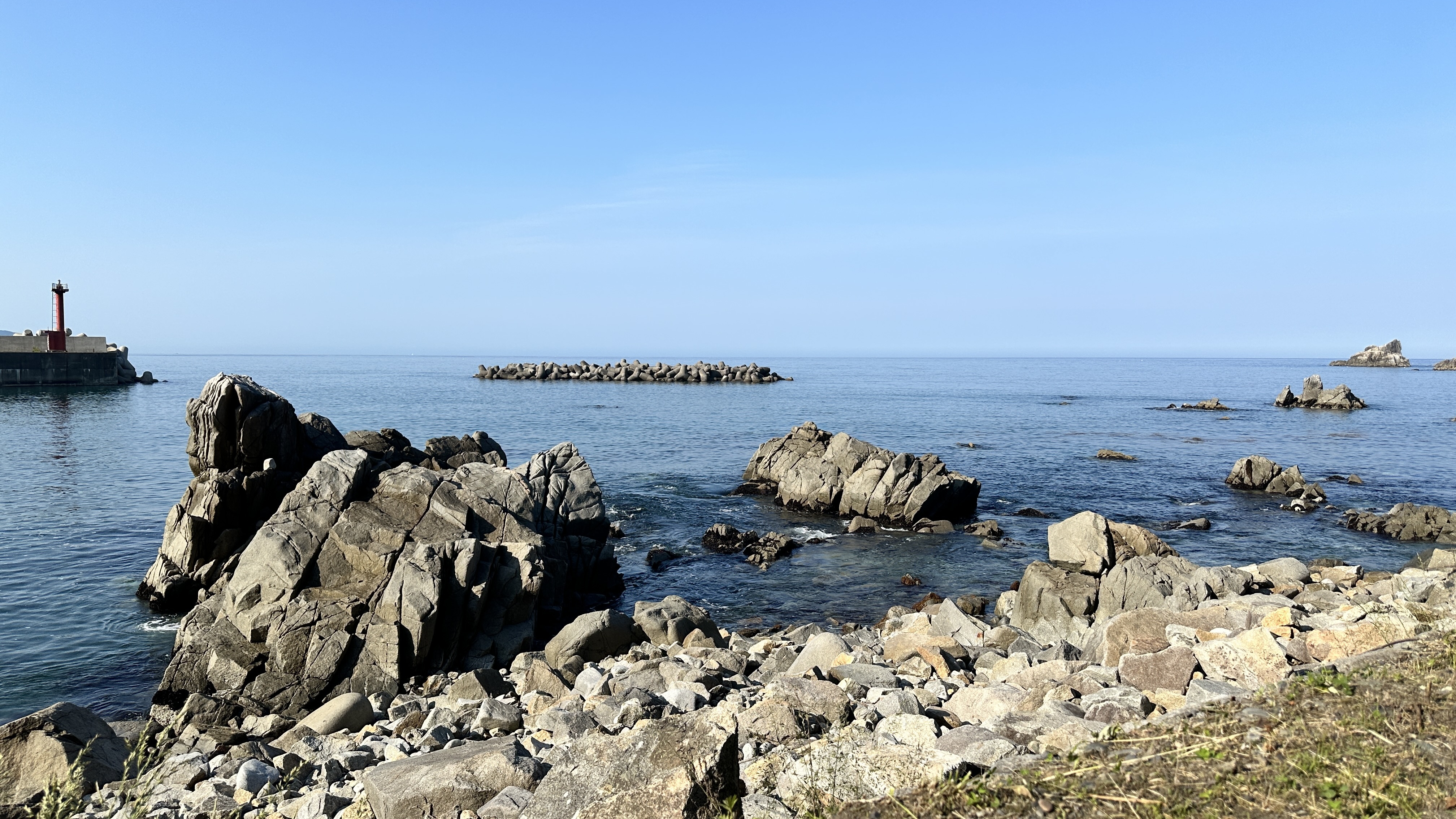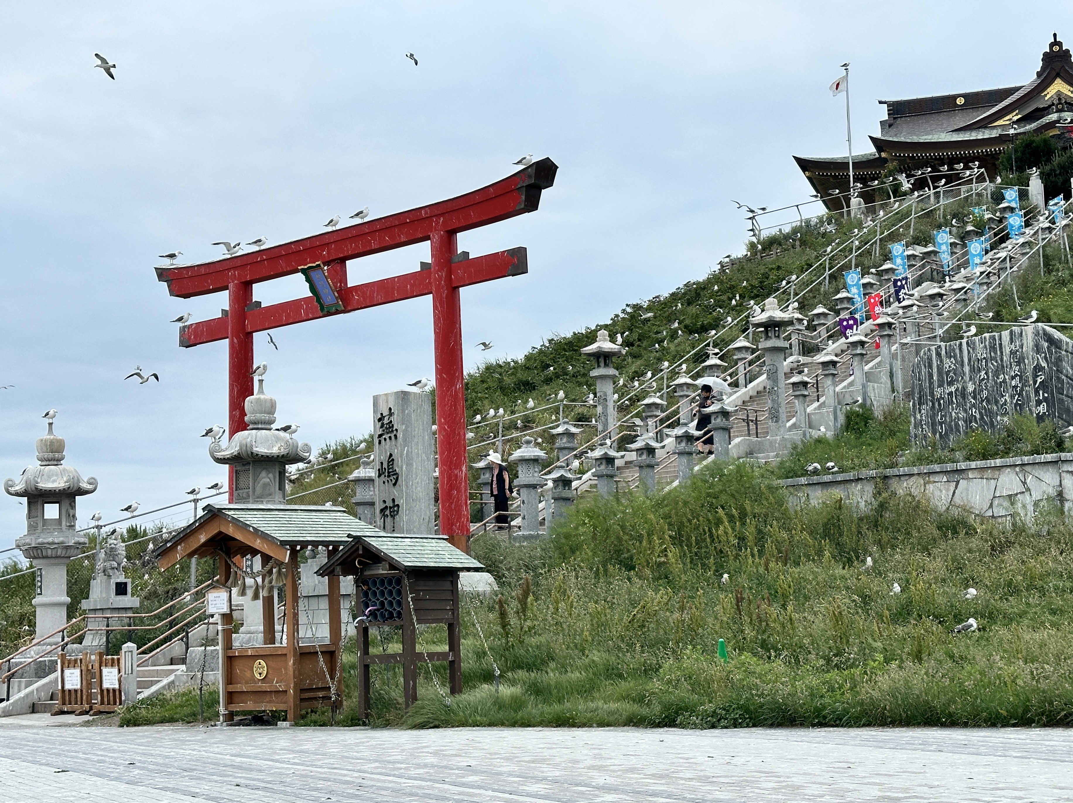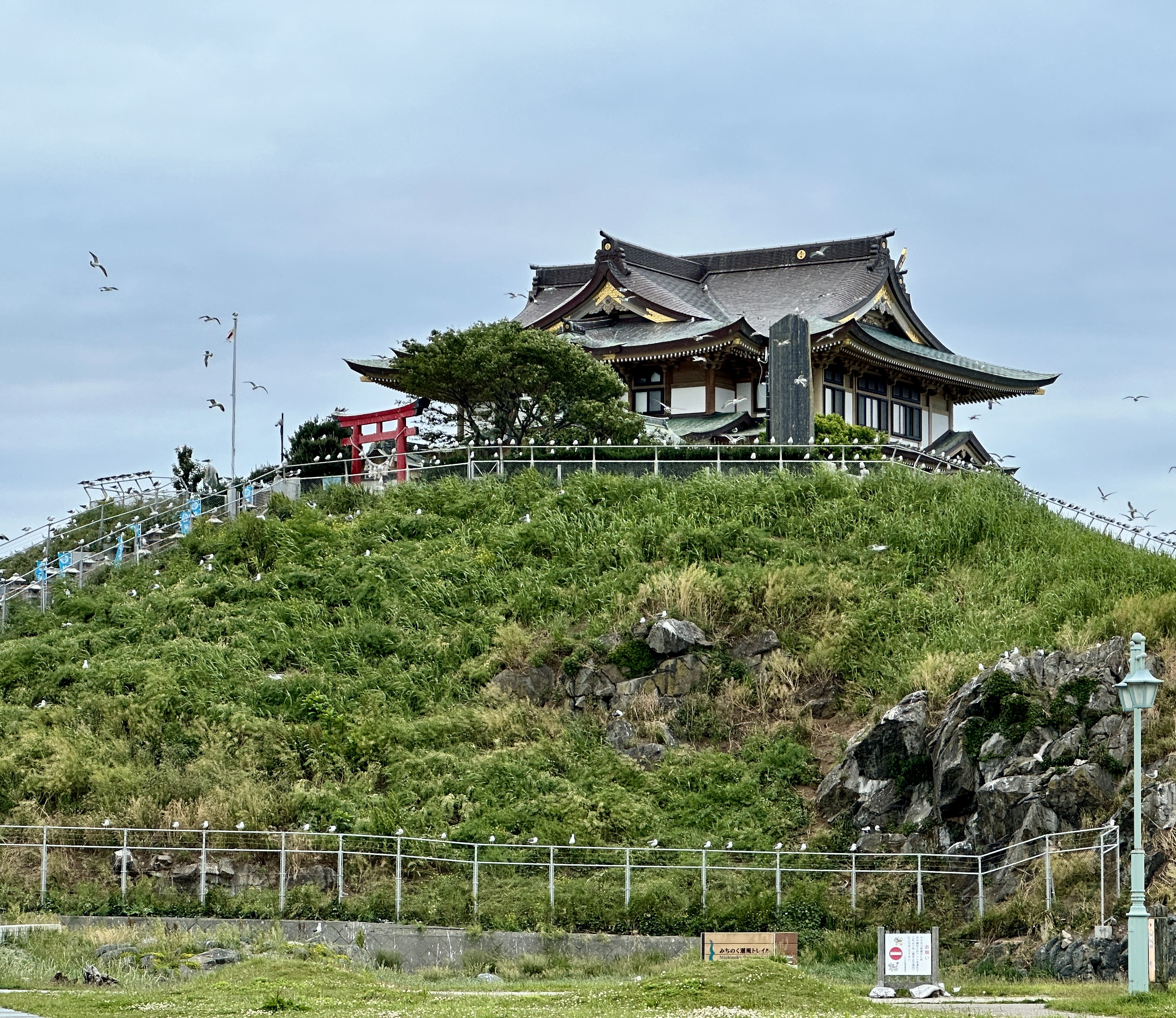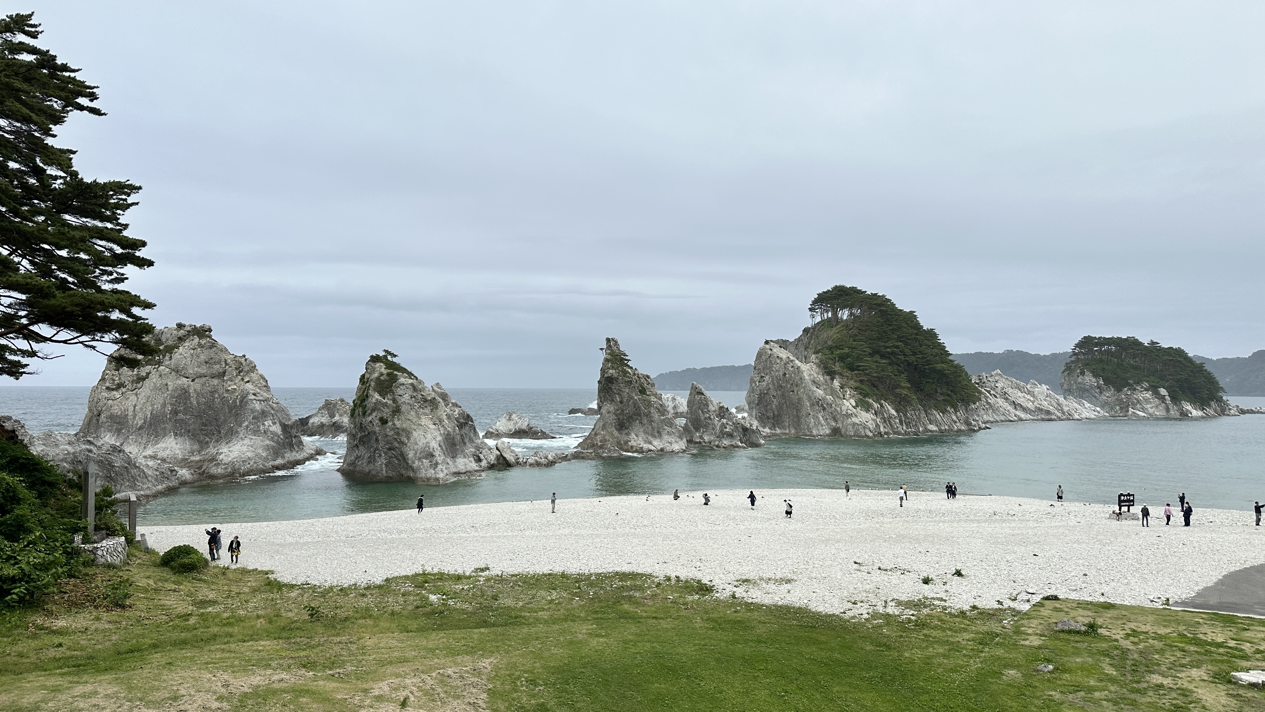 嗯,真是有點難以啟齒捏。會記錄下這個點完全是意外,因為我犯了一個相當低級的失誤…..(如下圖。)對!我居然在遊覽船的運休日來到這邊,到底!!!心裡不知道咒罵了自己幾次。但都遇到了,我也不可能隔天再跑一趟,索性就在這個遊客中心逛逛等待下一班巴士再前往淨土之濱了。雖說這邊只是個中繼處,外面也是規劃了好大一區讓遊客可以散步,然後被海風ㄙㄢˋ的類公園。反正我也沒船可以搭,就邊走邊在公園找了個視野好的座位,就吃起便利商店買的飯糰做午餐囉。這裡的港口景致還行,偏偏我遇上陰天,只能拍下幾張勉強及格的照片囉。(又運休又拍不好看,還有什麼用處啊我!)
