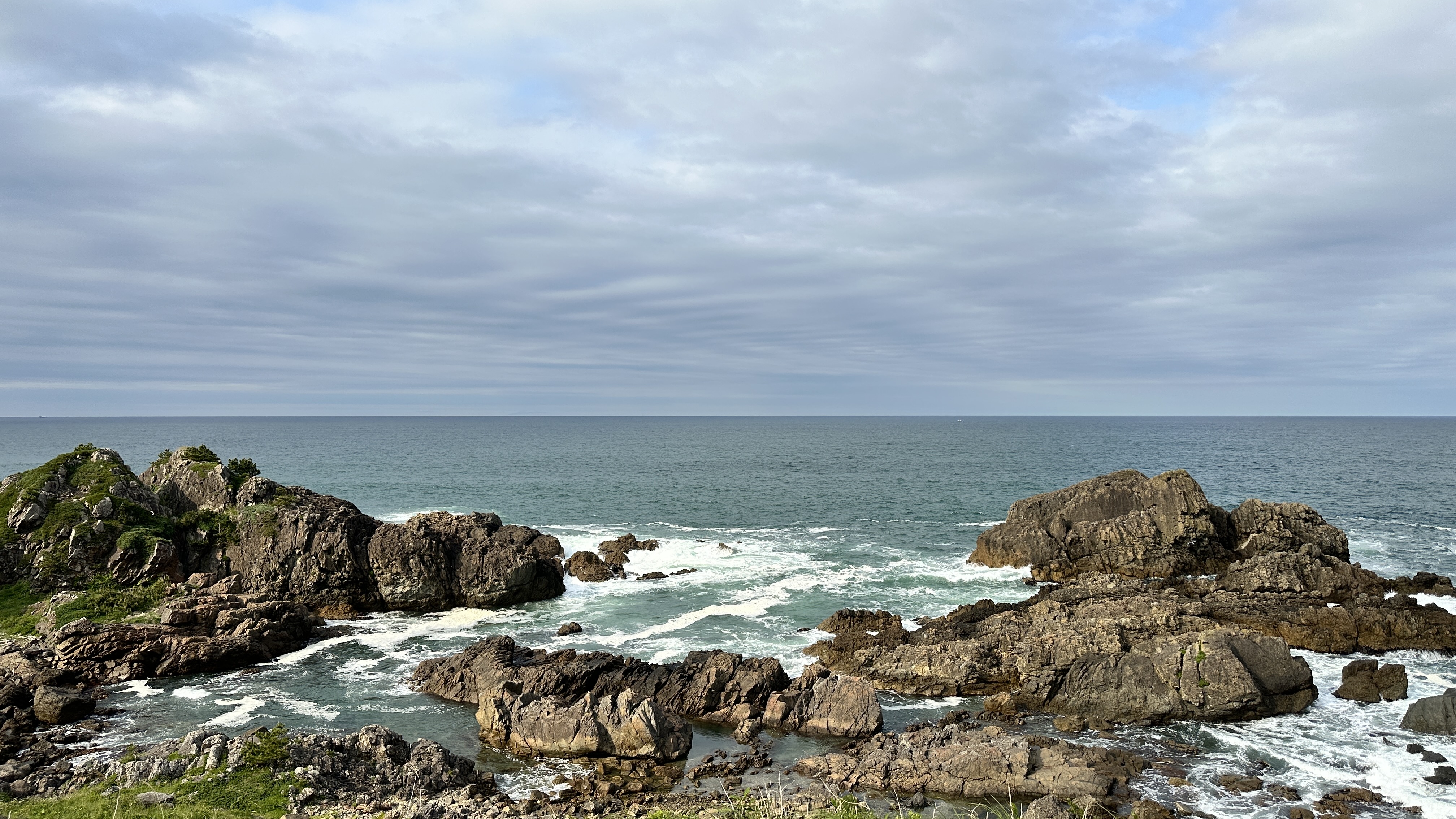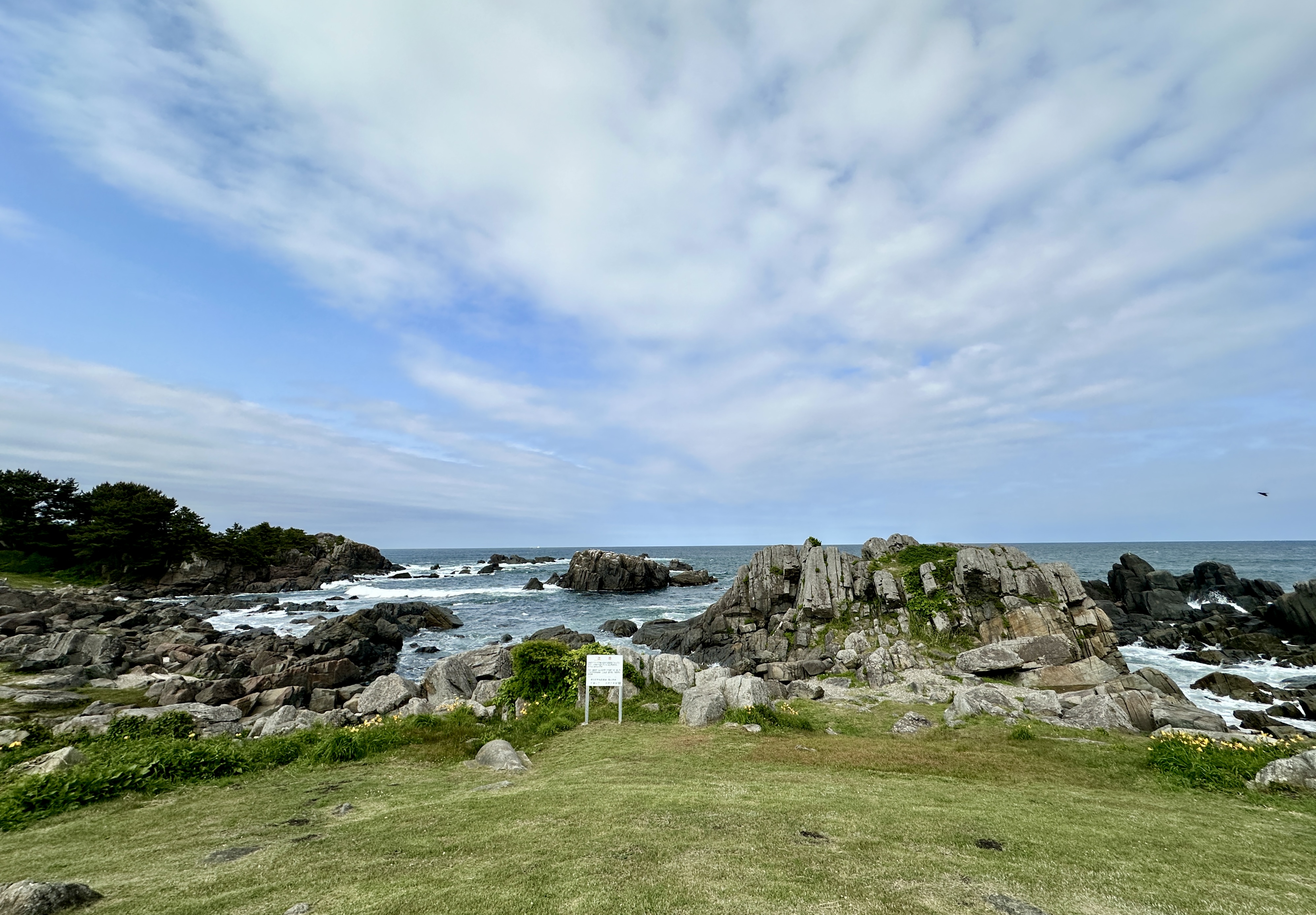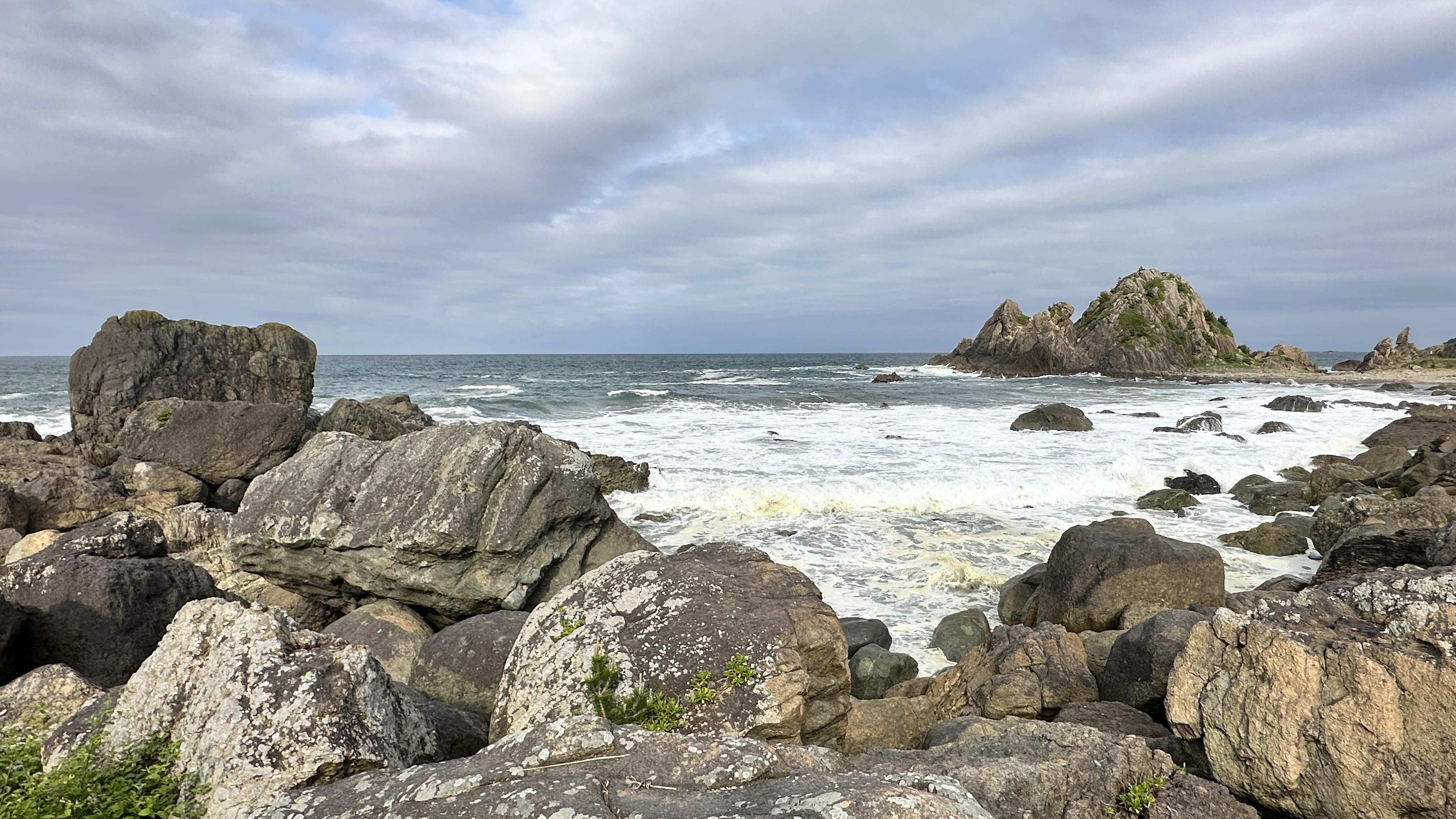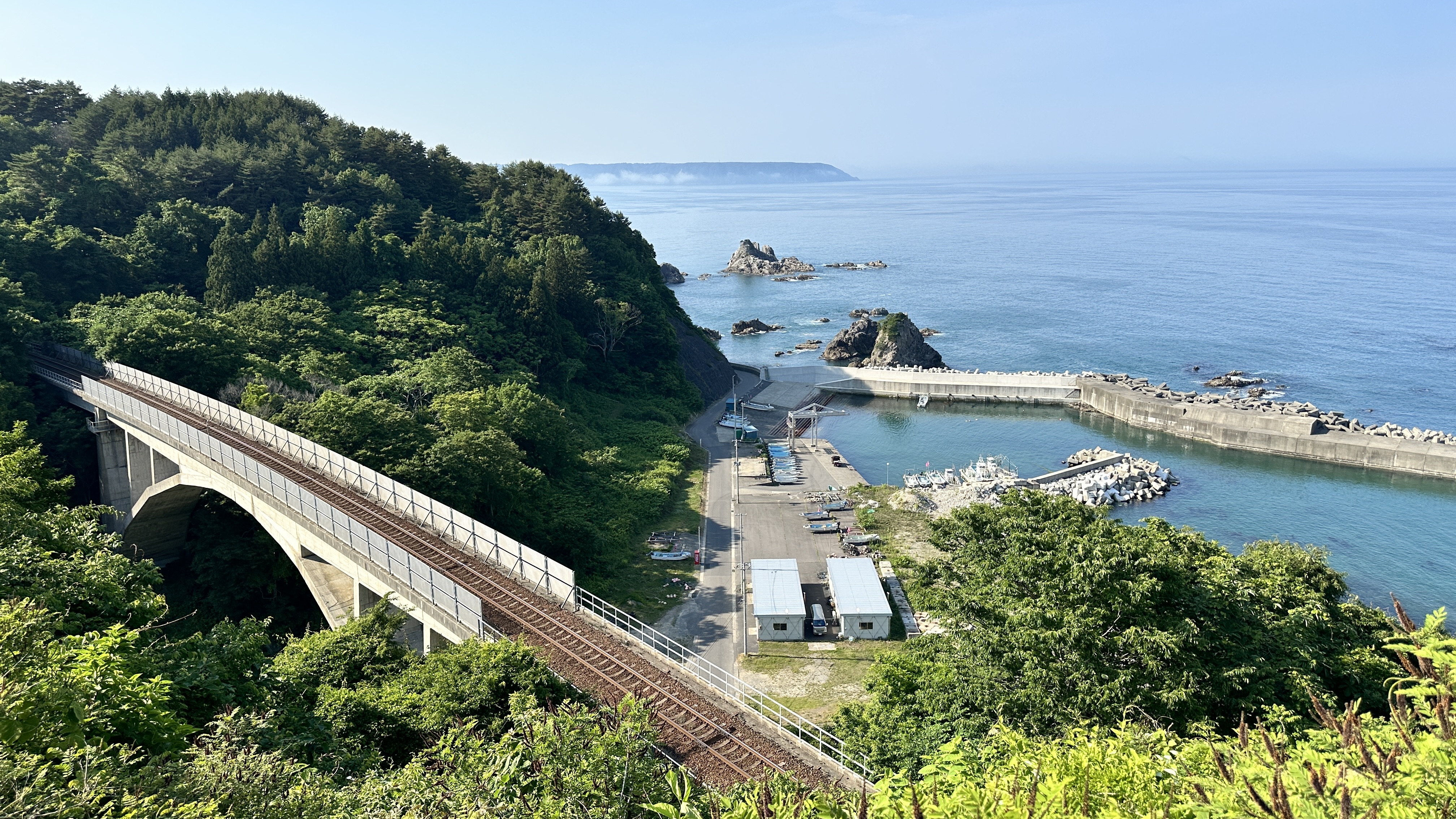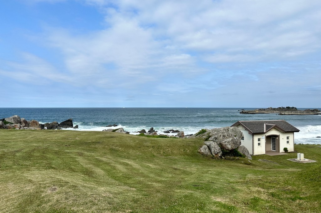 這裡真的挑戰到了自己的極限,這個點是前一個晚上在review行程的時候才誕生的,感謝網路的發達!這次旅程我多了一個習慣,每個晚上睡前都會重新review一次隔天的行程,讓我這趟走下來比過去都更順暢。回到正題,堀內這邊真的拜託要來,完全可以當成是私藏景點的。三陸鐵道除了司機會在特定路段、特定橋樑暫停並且跟乘客做導覽以外,堀內這邊是我查到可以讓鐵道迷來追車的一個好所在。班次不多,所以時間真的要抓好,然後也要祈禱一下天氣。我的經驗來說,我一下車即使飛奔也趕不上馬上有一班會經過這橋樑的,就以一般愜意的步伐走到レストハウスうしお等待下一車就好。也因為列車會在橋上暫停,所以非常好拍!要是運氣好遇到給力的氣候,一定可以拍到很不錯的影像的。而我的運氣很不意外的,濃霧在列車過去後才散開,所以…..嗯…..不多說。拍完列車距離回程的班次時間很充裕,所以就幫自己再加碼一個景點-まついそ公園,在回程路上有個叉路可以切過去,路程不短(會經過一小段墓地,個人覺得不用在日本真的不用特別避諱。),可以更靠近這邊的海岸,順著往前走就有另外的道路連接回車站,完全是順路的。(霧都散去了,不把握嗎我。)