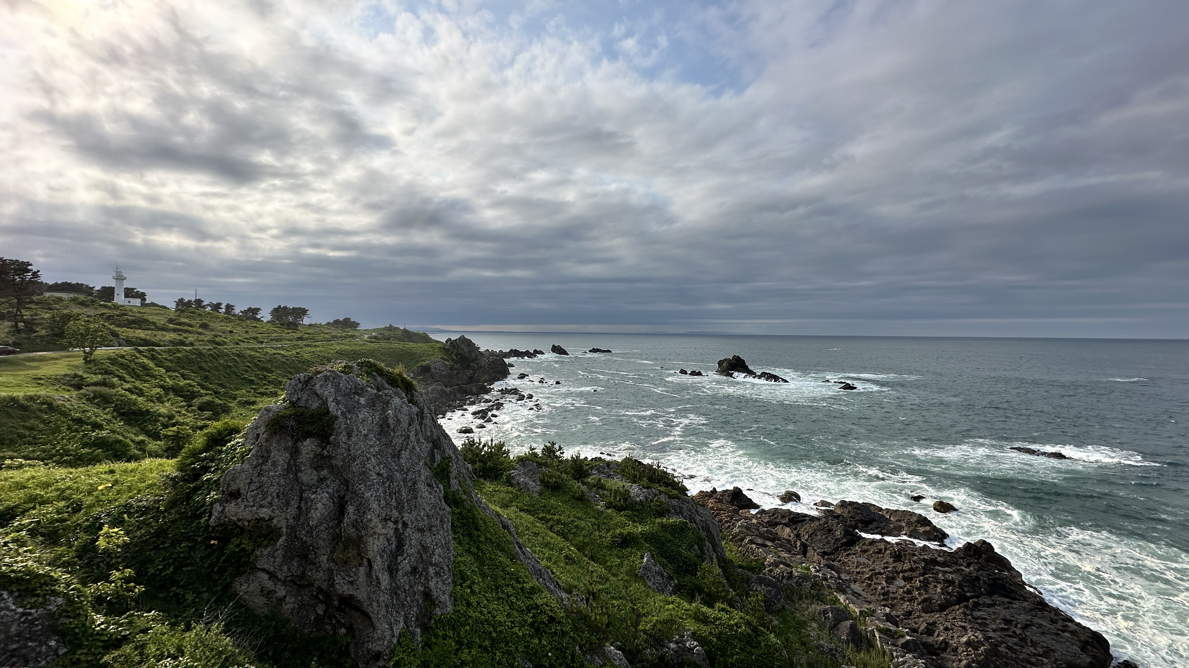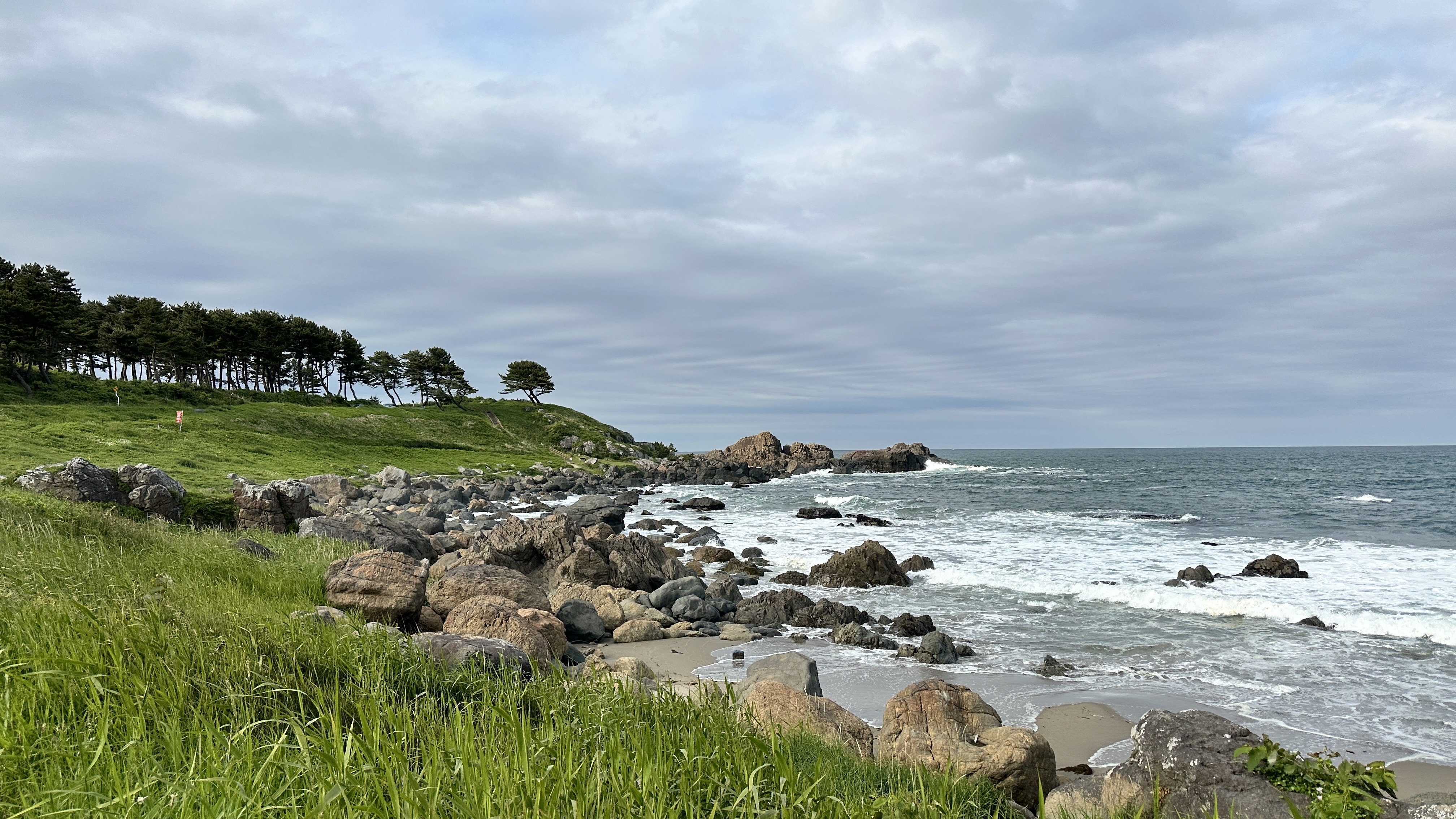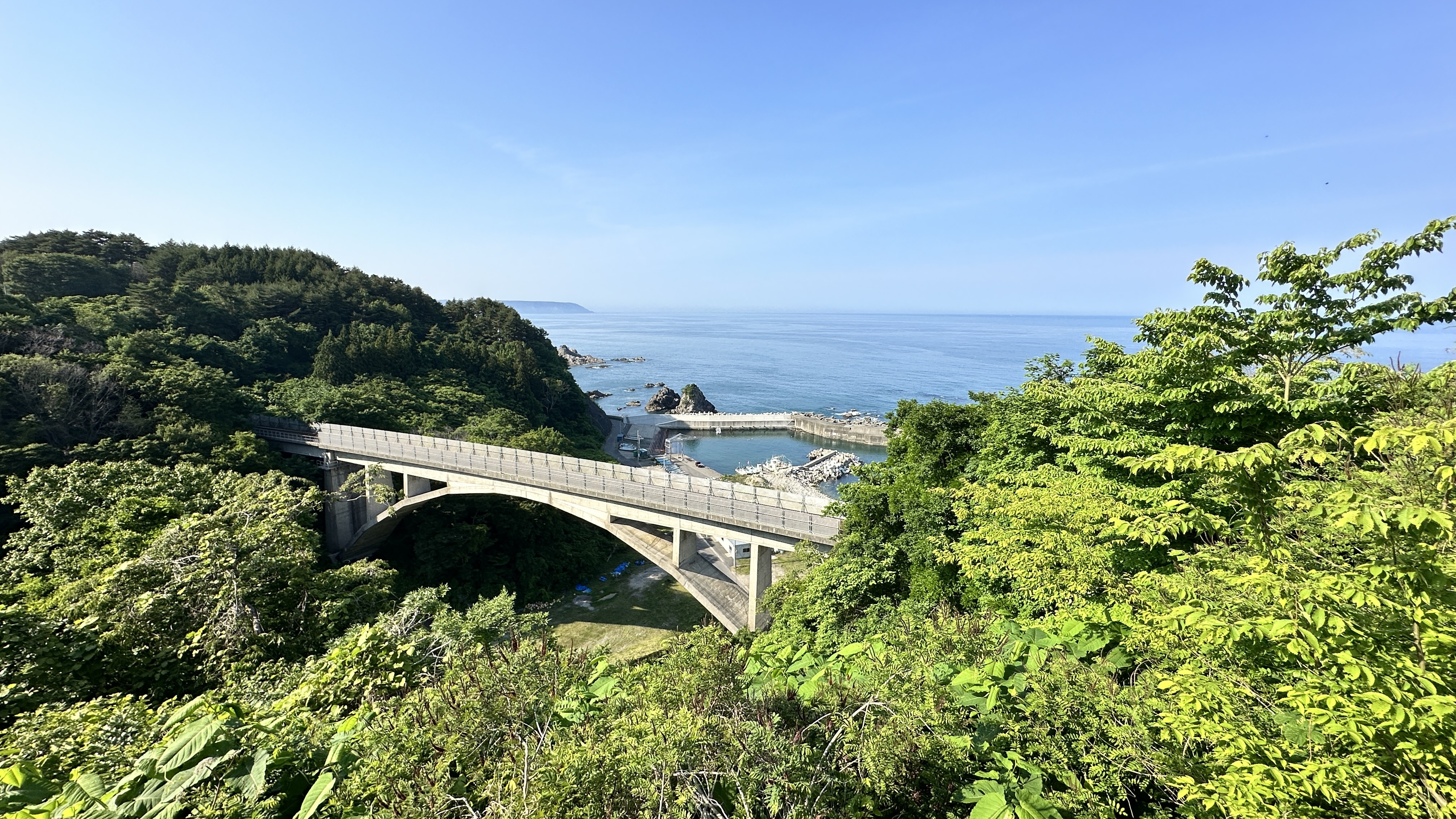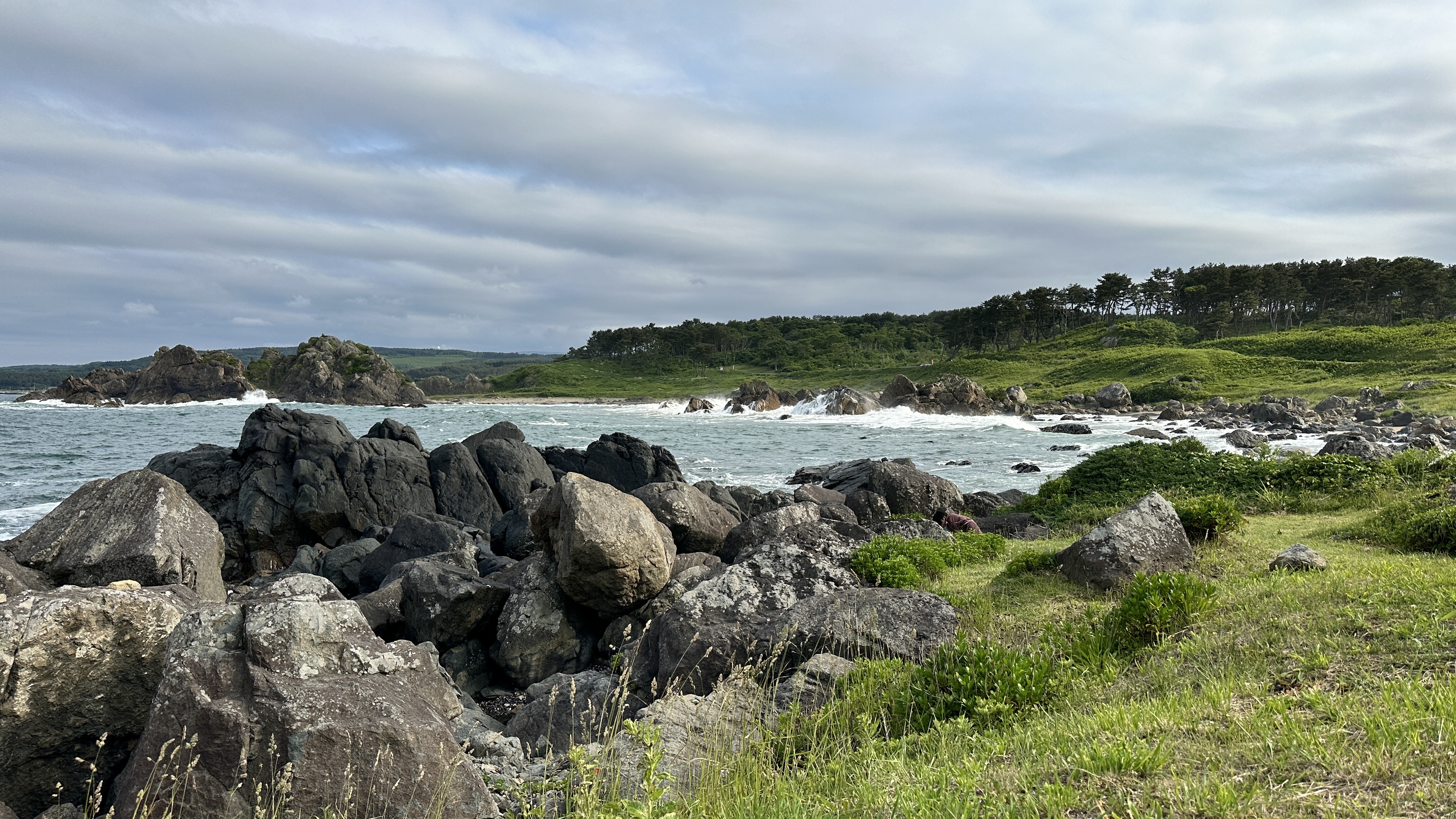 這裡真的挑戰到了自己的極限,這個點是前一個晚上在review行程的時候才誕生的,感謝網路的發達!這次旅程我多了一個習慣,每個晚上睡前都會重新review一次隔天的行程,讓我這趟走下來比過去都更順暢。回到正題,堀內這邊真的拜託要來,完全可以當成是私藏景點的。三陸鐵道除了司機會在特定路段、特定橋樑暫停並且跟乘客做導覽以外,堀內這邊是我查到可以讓鐵道迷來追車的一個好所在。班次不多,所以時間真的要抓好,然後也要祈禱一下天氣。我的經驗來說,我一下車即使飛奔也趕不上馬上有一班會經過這橋樑的,就以一般愜意的步伐走到レストハウスうしお等待下一車就好。也因為列車會在橋上暫停,所以非常好拍!要是運氣好遇到給力的氣候,一定可以拍到很不錯的影像的。而我的運氣很不意外的,濃霧在列車過去後才散開,所以…..嗯…..不多說。拍完列車距離回程的班次時間很充裕,所以就幫自己再加碼一個景點-まついそ公園,在回程路上有個叉路可以切過去,路程不短(會經過一小段墓地,個人覺得不用在日本真的不用特別避諱。),可以更靠近這邊的海岸,順著往前走就有另外的道路連接回車站,完全是順路的。(霧都散去了,不把握嗎我。)