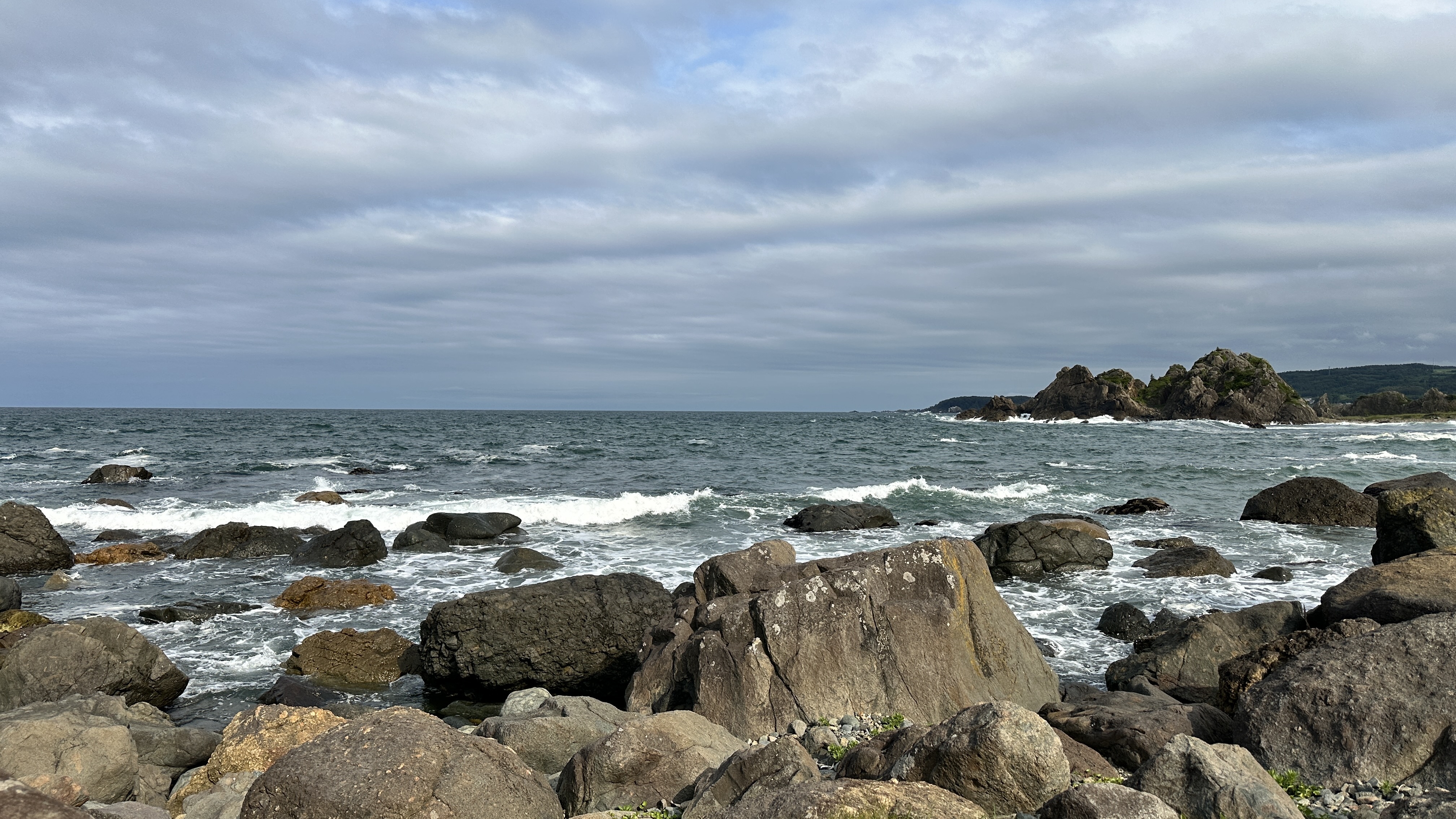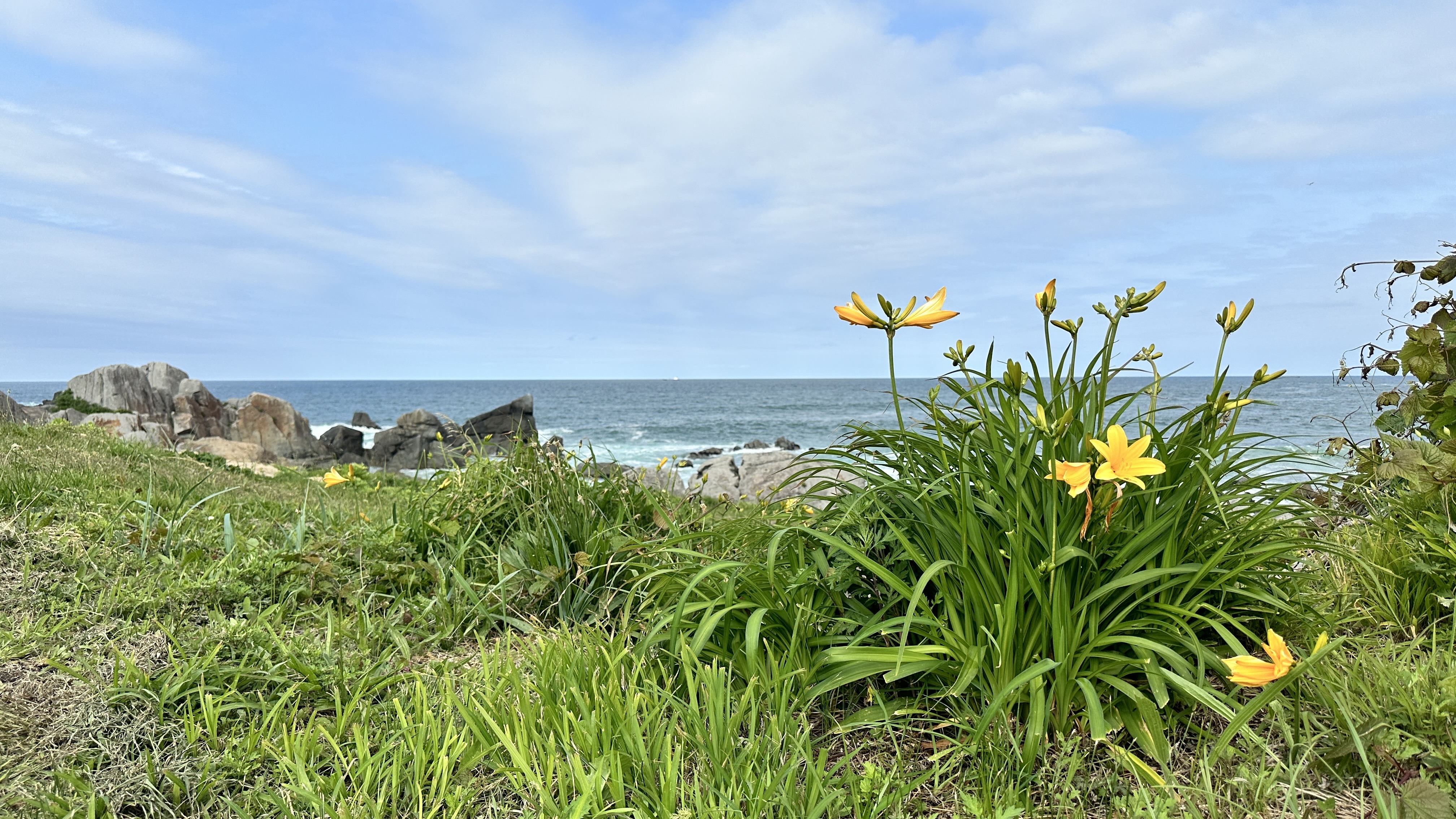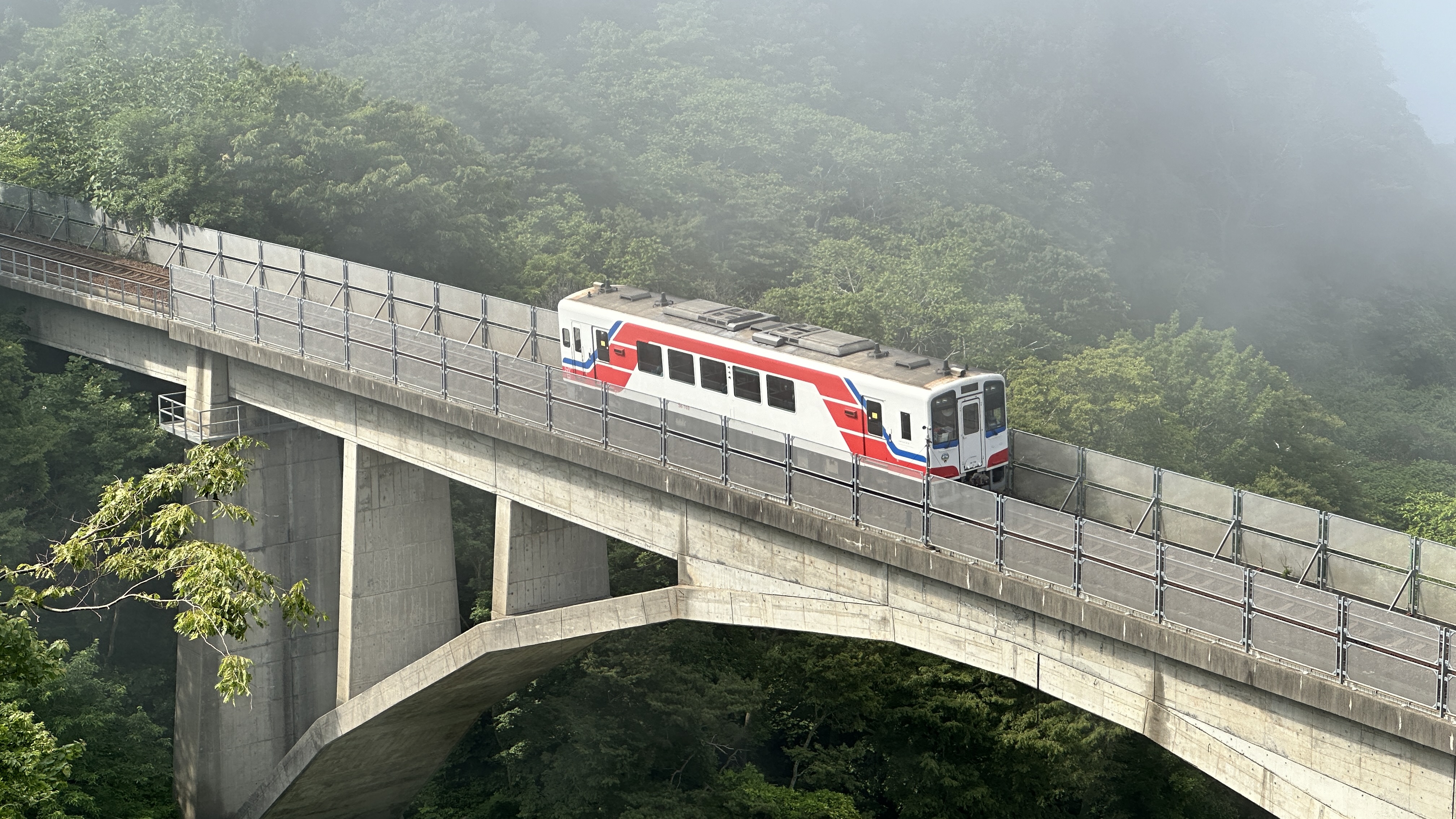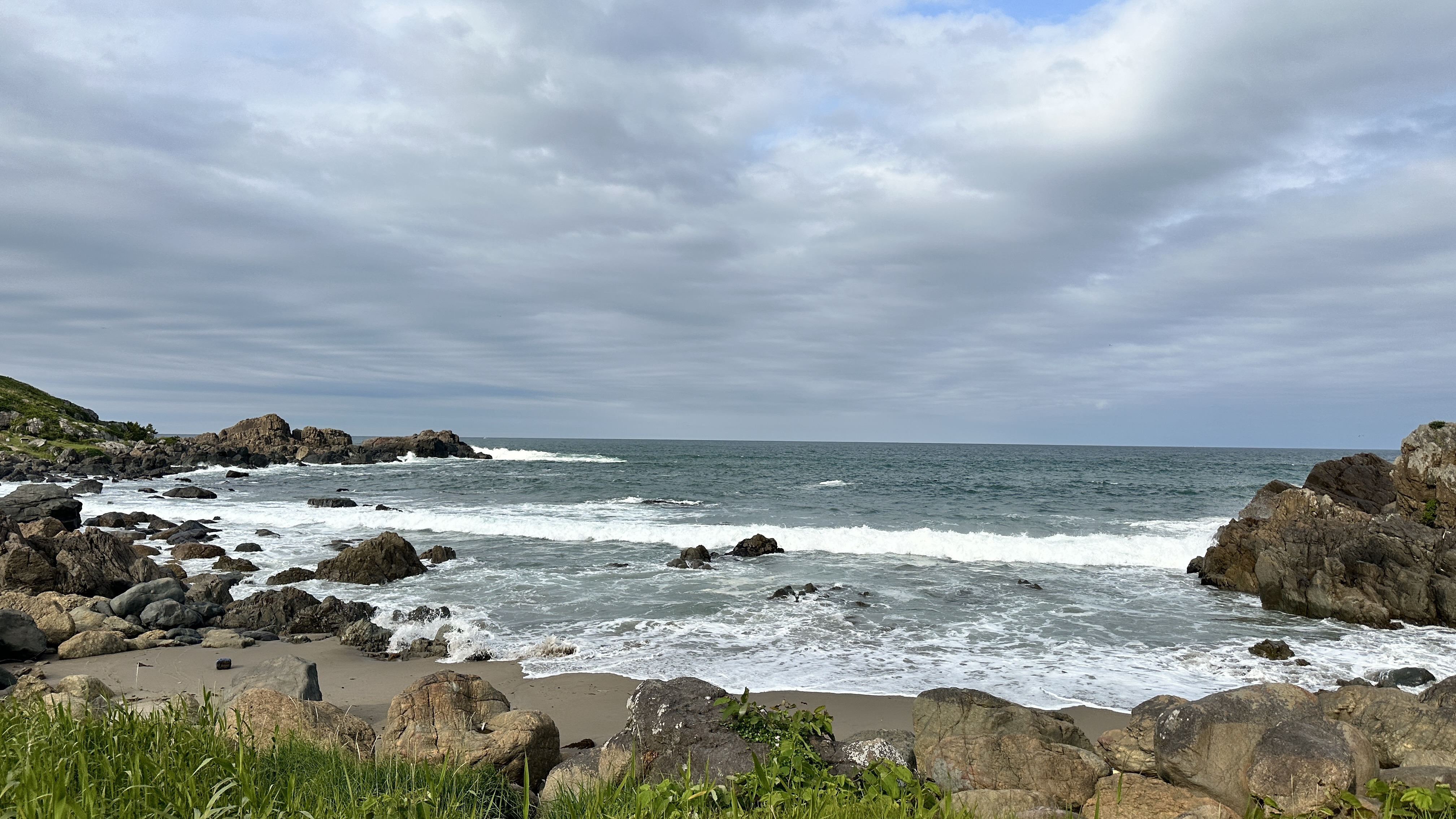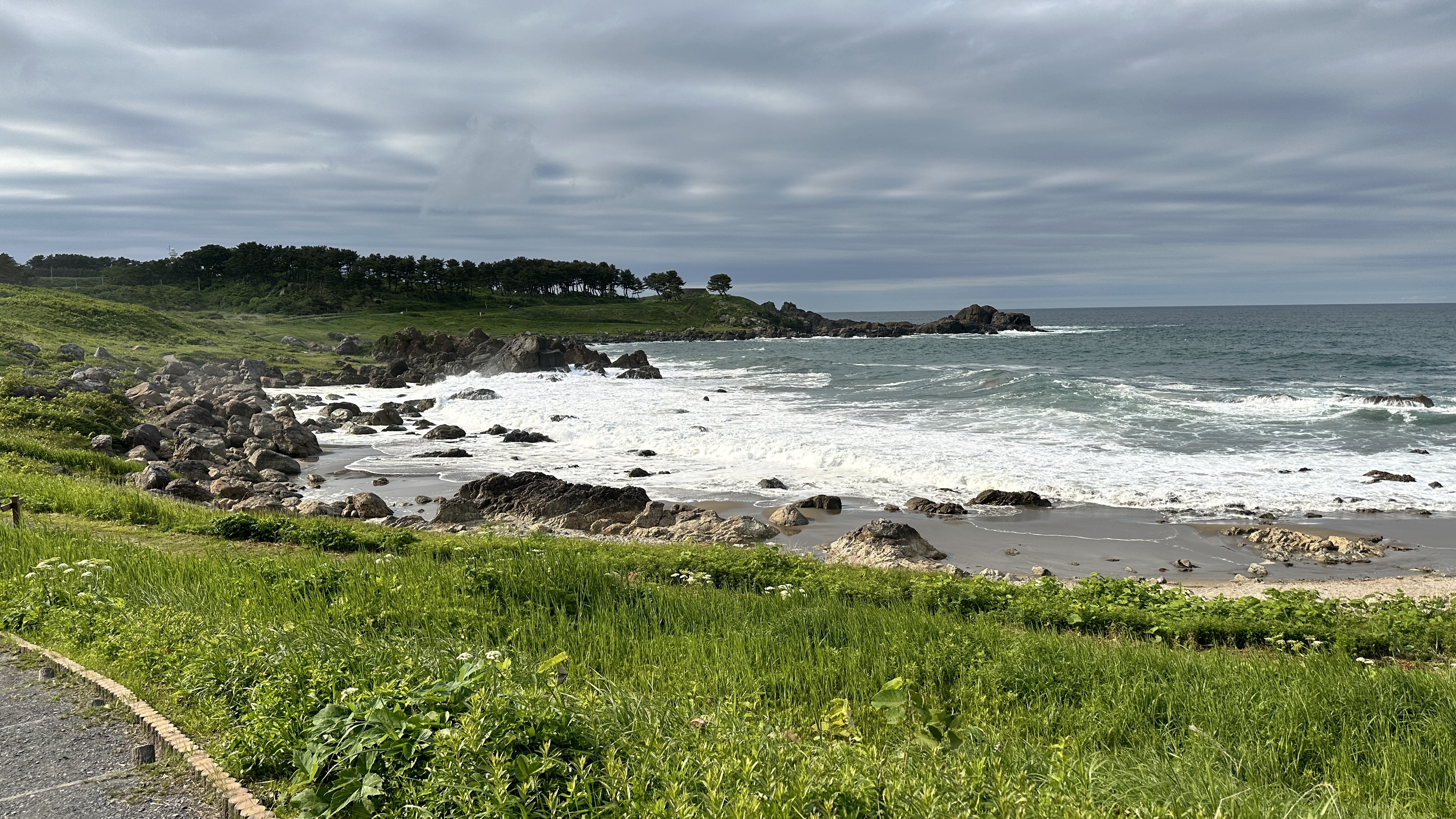 這裡真的挑戰到了自己的極限,這個點是前一個晚上在review行程的時候才誕生的,感謝網路的發達!這次旅程我多了一個習慣,每個晚上睡前都會重新review一次隔天的行程,讓我這趟走下來比過去都更順暢。回到正題,堀內這邊真的拜託要來,完全可以當成是私藏景點的。三陸鐵道除了司機會在特定路段、特定橋樑暫停並且跟乘客做導覽以外,堀內這邊是我查到可以讓鐵道迷來追車的一個好所在。班次不多,所以時間真的要抓好,然後也要祈禱一下天氣。我的經驗來說,我一下車即使飛奔也趕不上馬上有一班會經過這橋樑的,就以一般愜意的步伐走到レストハウスうしお等待下一車就好。也因為列車會在橋上暫停,所以非常好拍!要是運氣好遇到給力的氣候,一定可以拍到很不錯的影像的。而我的運氣很不意外的,濃霧在列車過去後才散開,所以…..嗯…..不多說。拍完列車距離回程的班次時間很充裕,所以就幫自己再加碼一個景點-まついそ公園,在回程路上有個叉路可以切過去,路程不短(會經過一小段墓地,個人覺得不用在日本真的不用特別避諱。),可以更靠近這邊的海岸,順著往前走就有另外的道路連接回車站,完全是順路的。(霧都散去了,不把握嗎我。)
